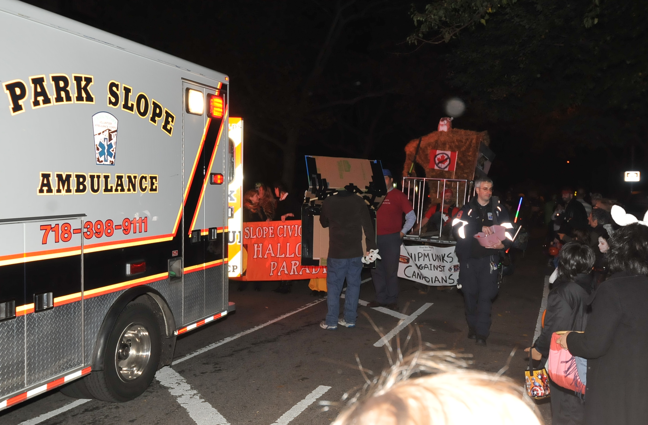 7:13 PM. The official banner starting the parade. With a Chipmunks against Canadians float.