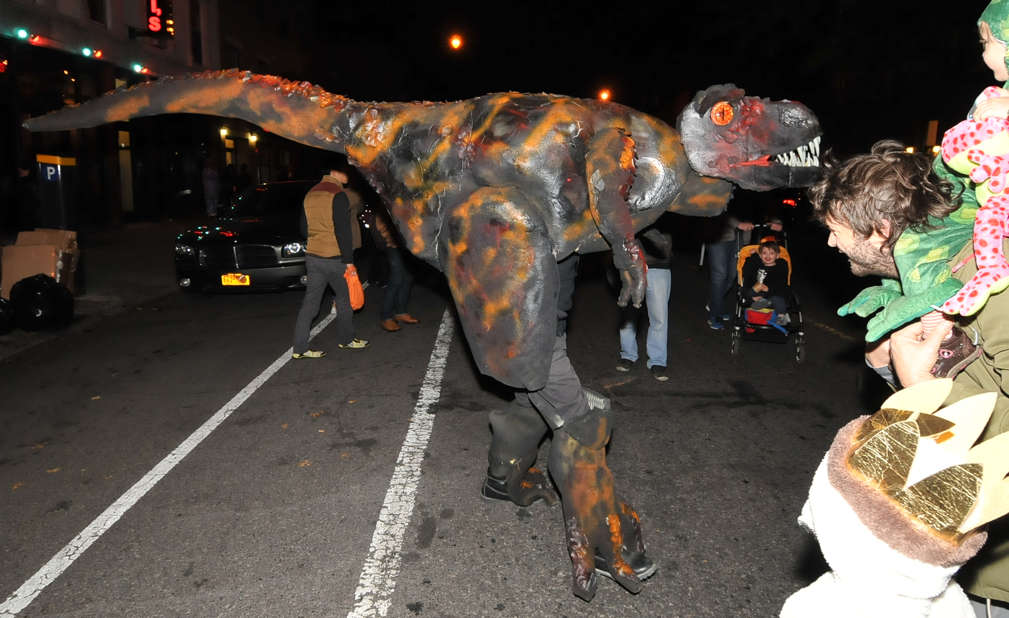 7:50 PM. A large Tyrannosaurus rex dinosaur puppet.