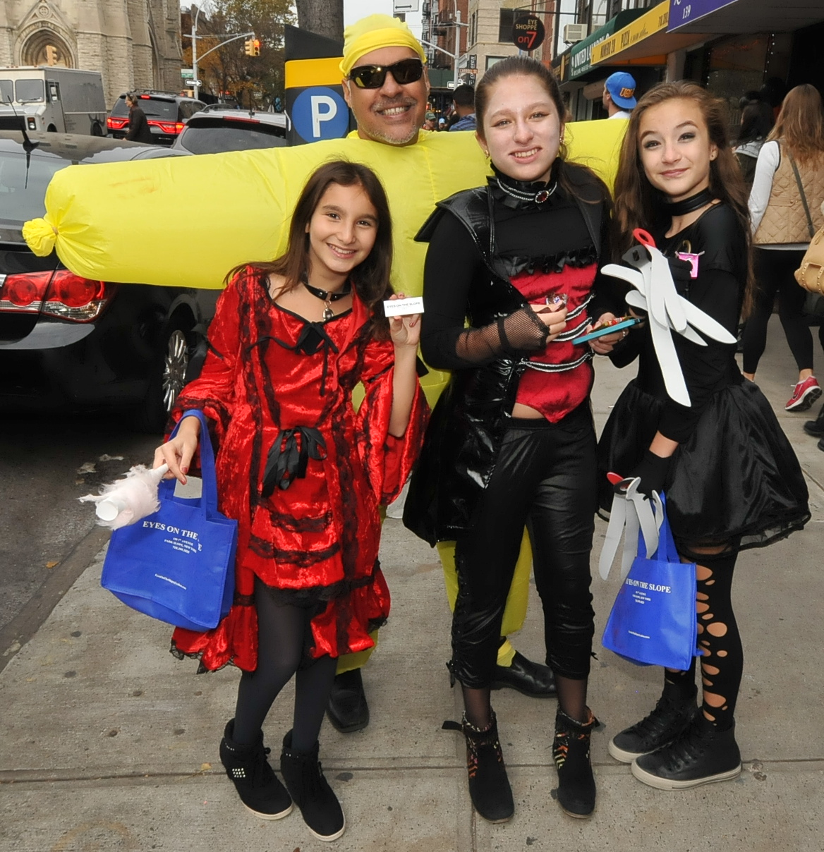 3:36 PM. Little Red Riding Hood from California Costumes, ? with scissors, and ?. In back is an inflatable banana.