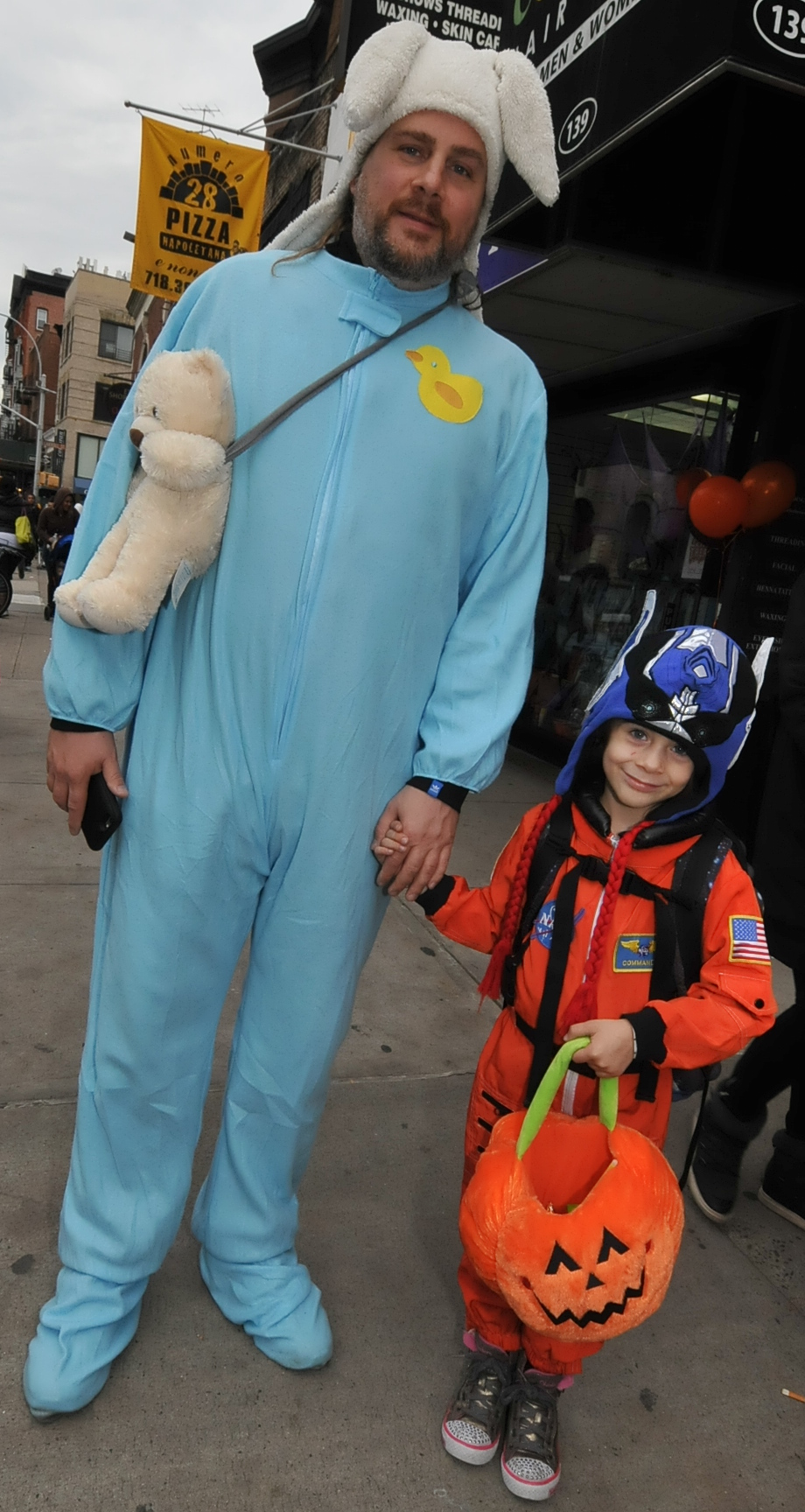 4:19 PM. Tha man dressed as a baby in pyjamas. The kid is an astronaut