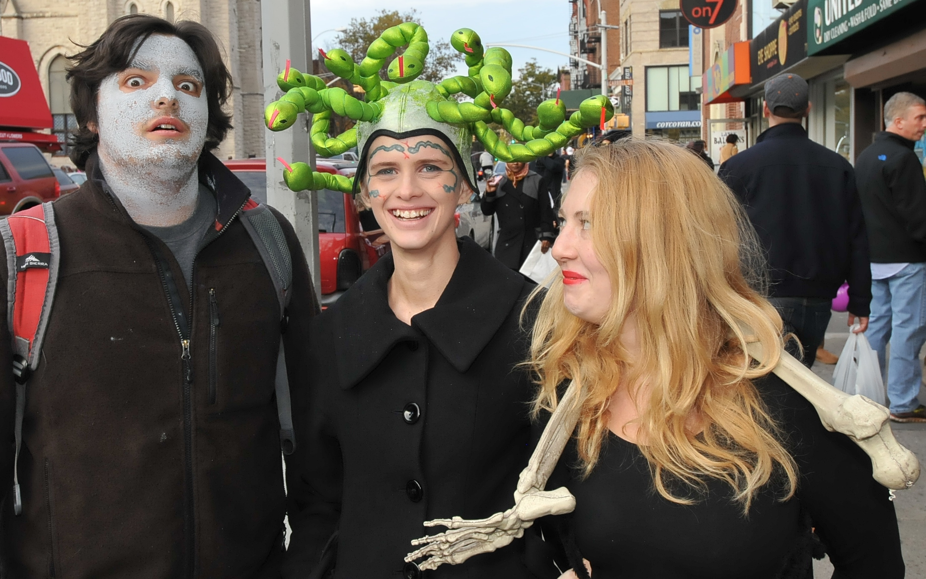 4:56 PM. A zombie, Medusa, and a skeleton.