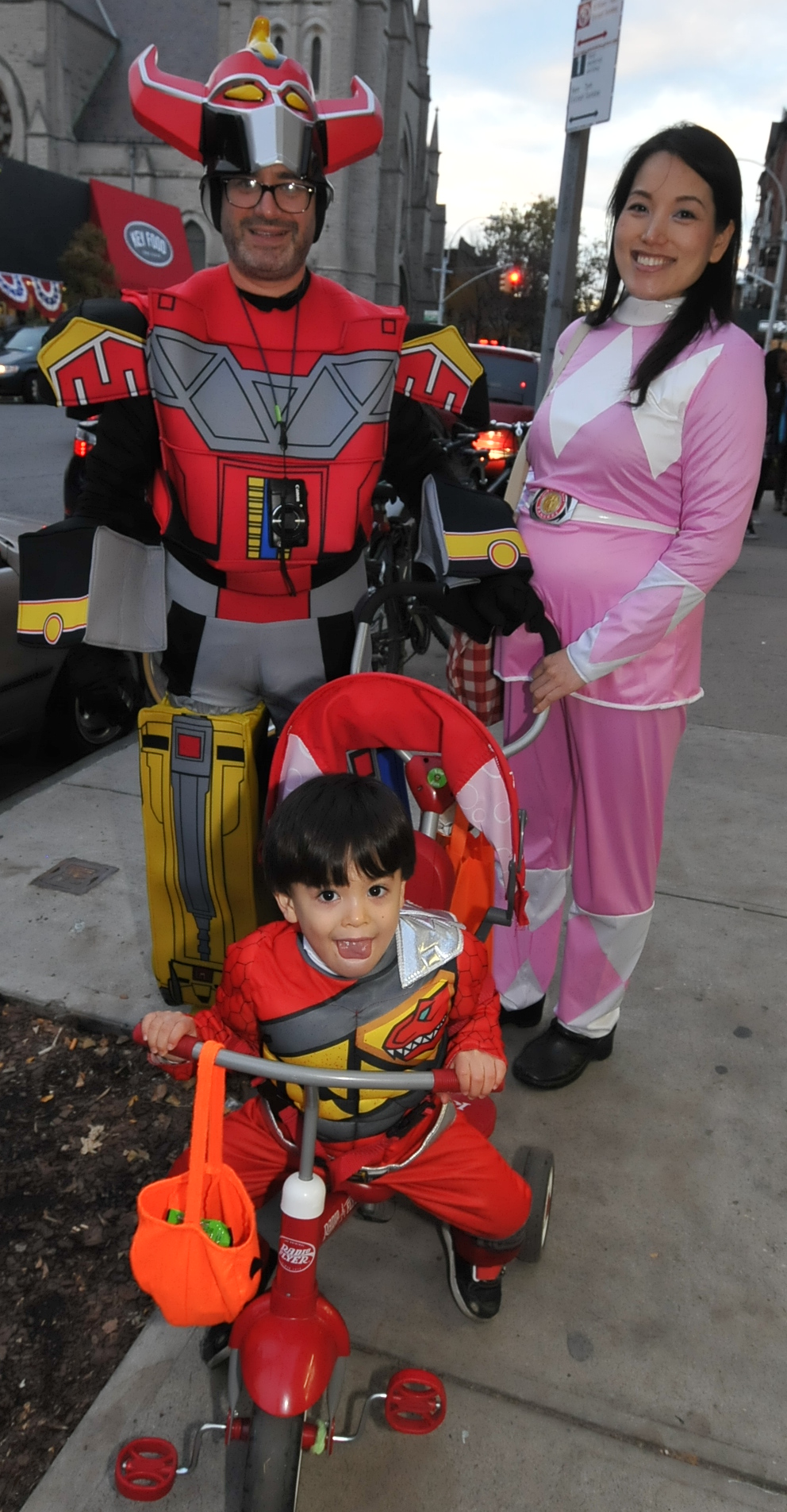 5:38 PM. Power Rangers costumes: The man is wearing a Megazord costume, the woman is in a Pink Ranger costume, and the child is dressed as the Red Ranger.