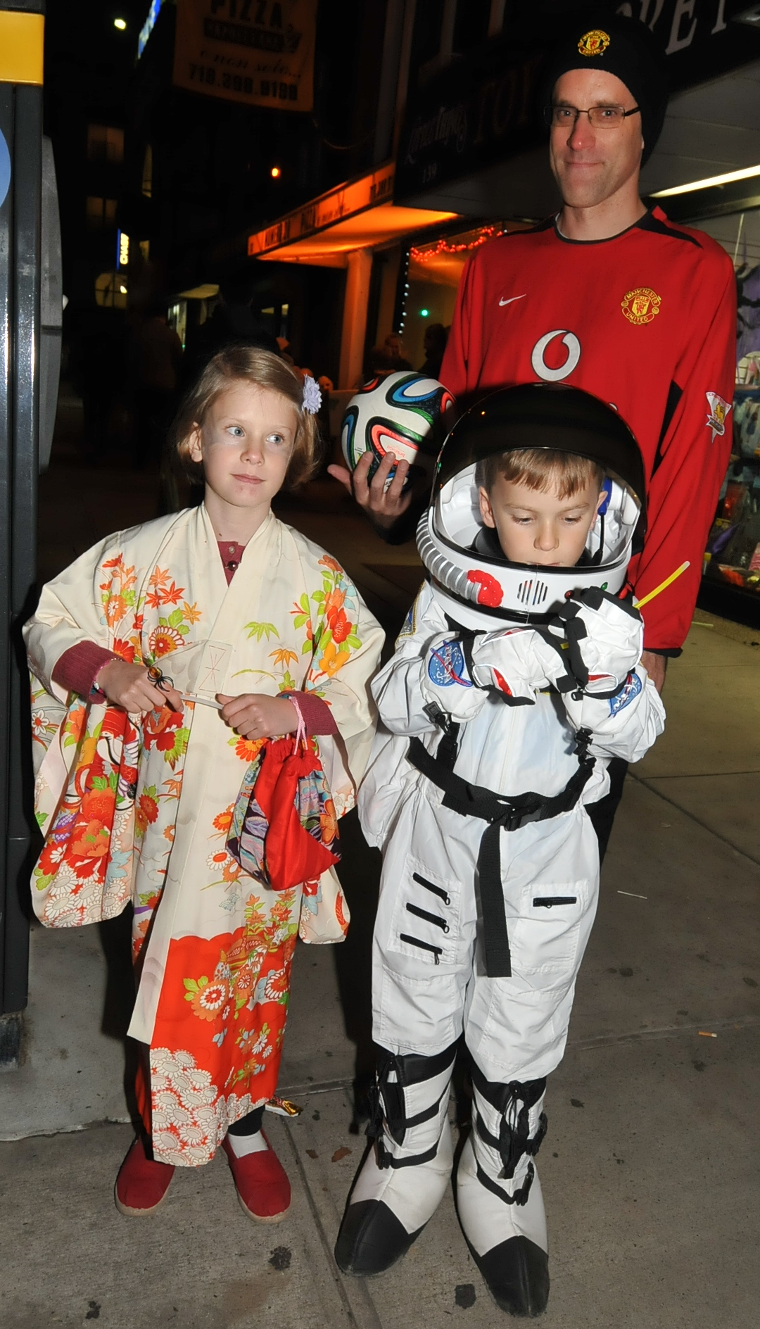 6:21 PM. The girl in a kimono. The boy is an astronaut. The man is wearing a Manchester United football jersey.