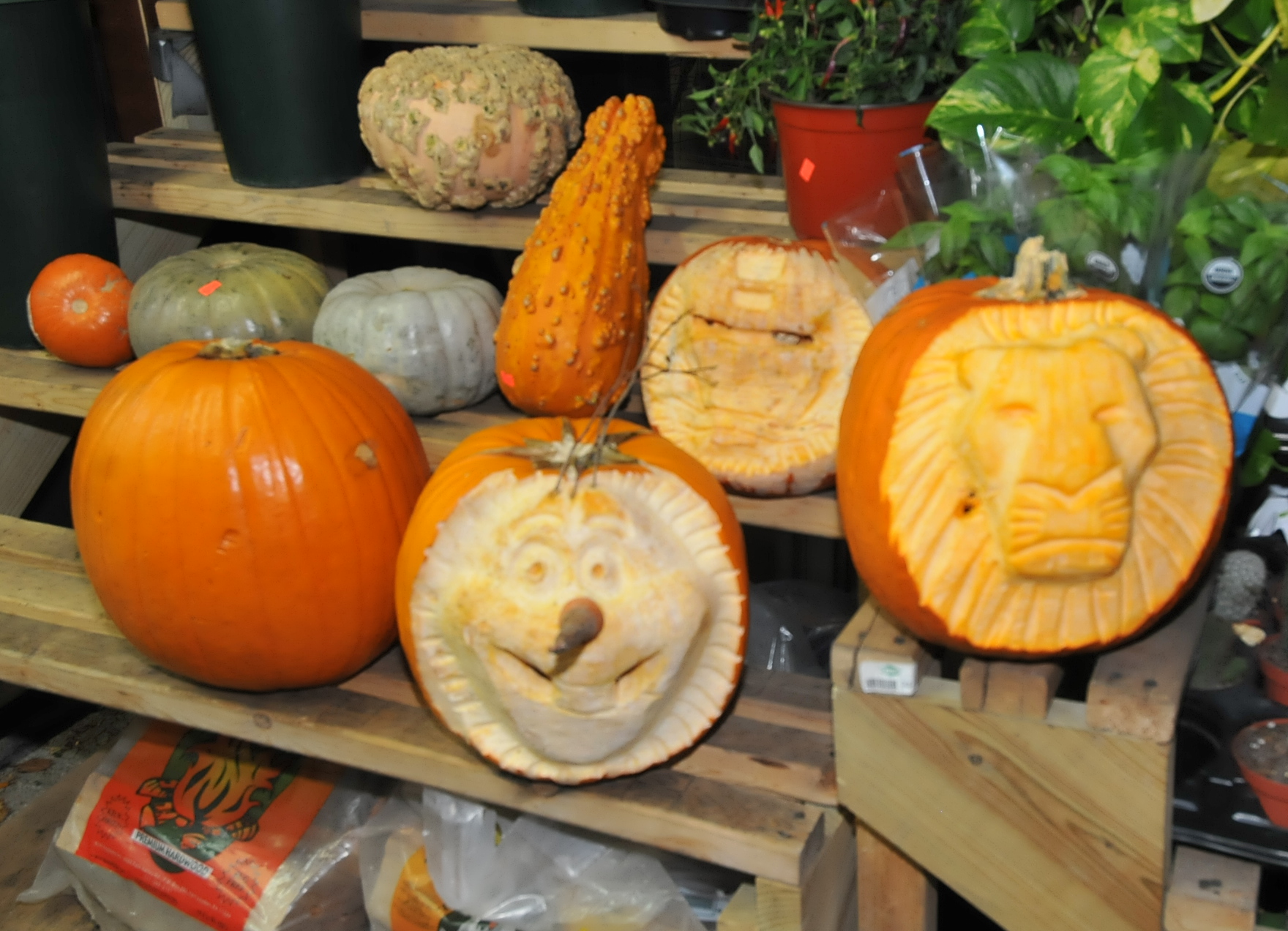 6:32 PM. A collection of carved pumpkins and gourds.