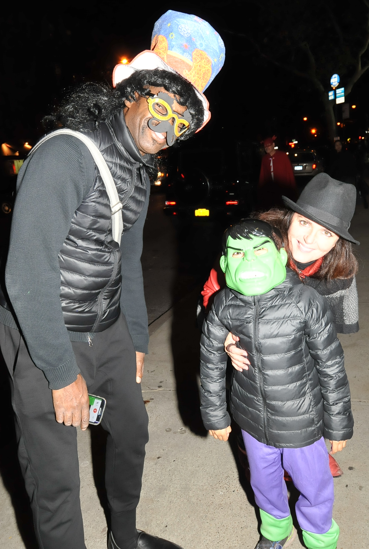 6:33 PM. Wearing Groucho Marx glasses and ? hat. Child is in a Hulk costume.