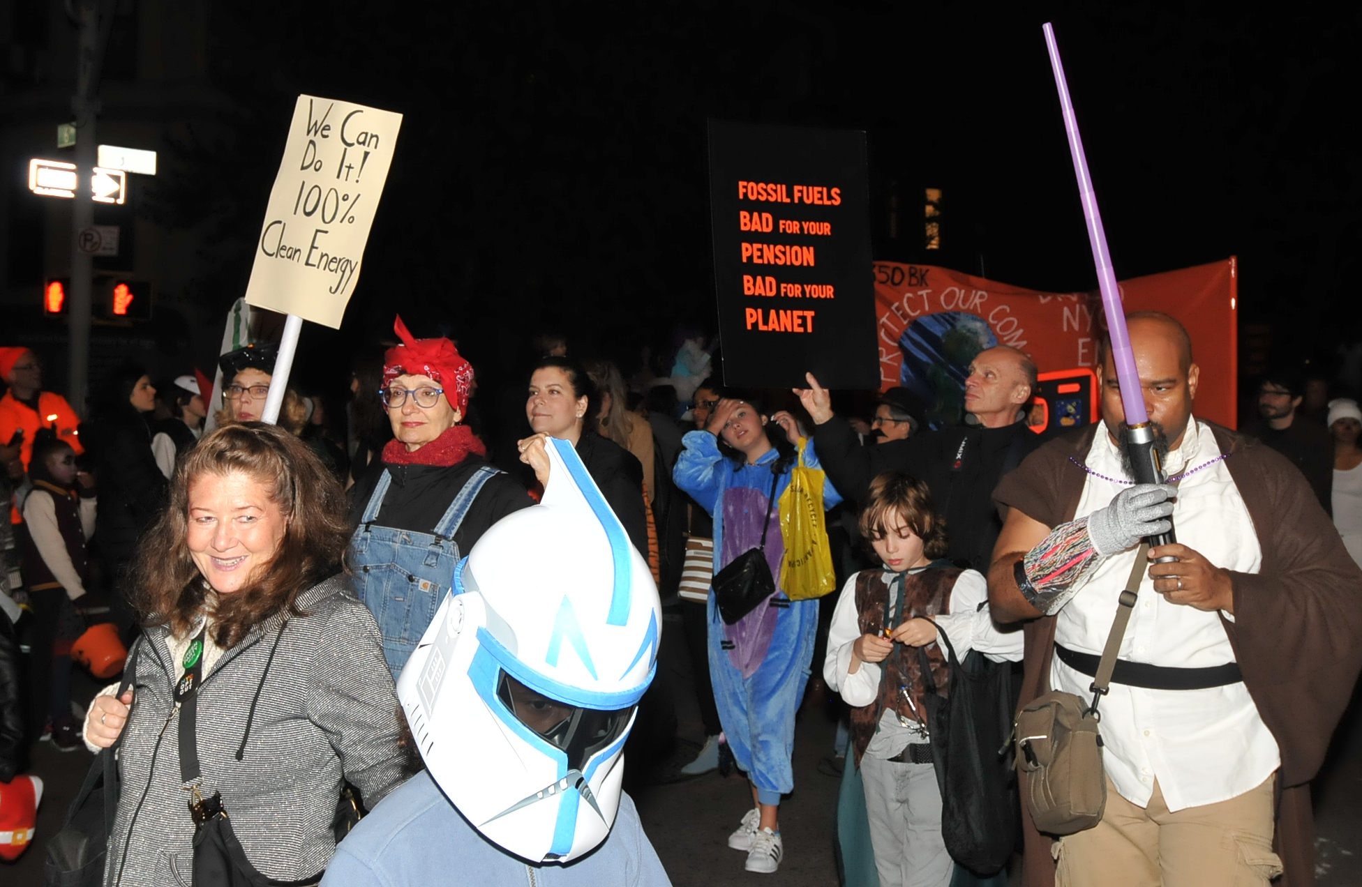 7:29 PM. A sign for "We Can Do It! 100% Clean Energy." A Captain Rex helmet from Star Wars. A sign with "Fossil Fuels: Bad for your Pension, Bad for your Planet."