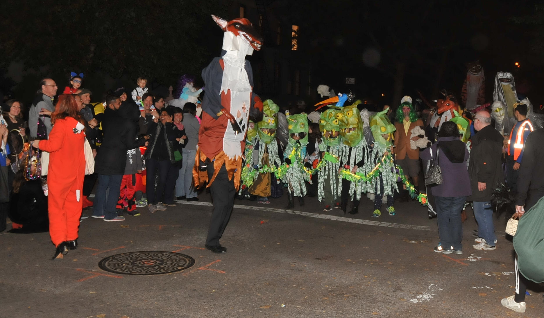 7:29 PM. A tall puppet of a fox. In back, green monsters.