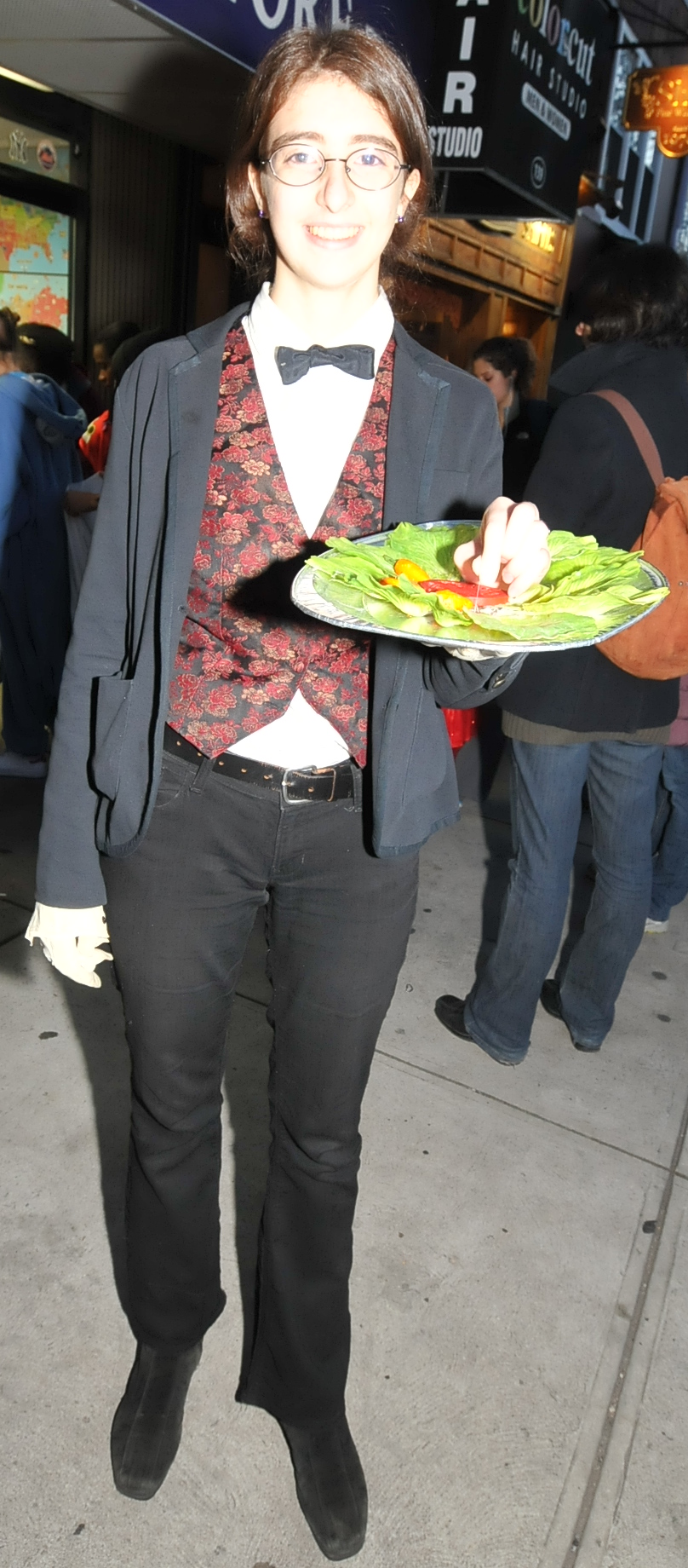 5:58 PM. A waitress serving a plate with a lettuce salad, which has a hand reaching up to eat the tomato slice.