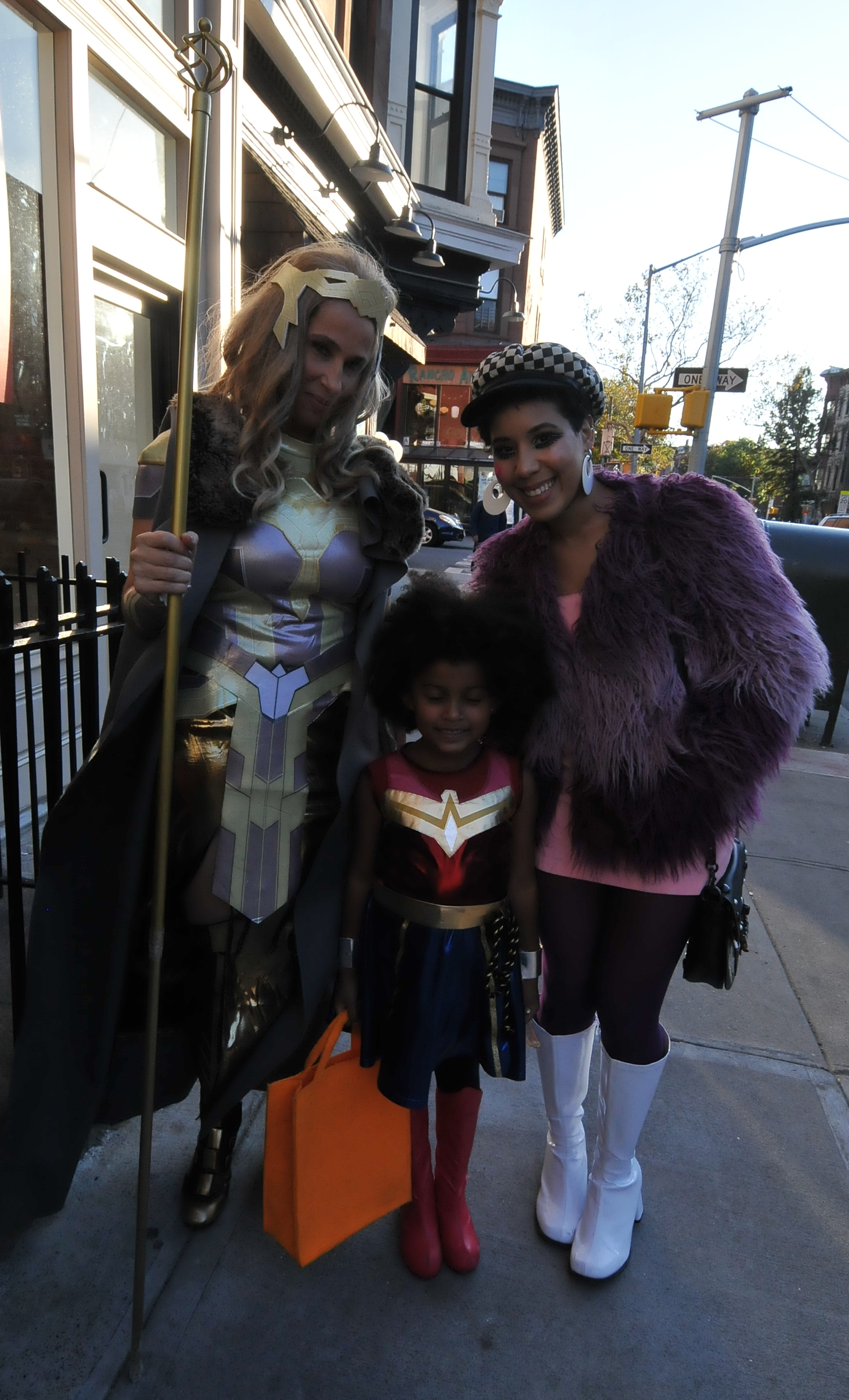 4:37 PM. Queen Hippolyta, the mother of Wonder Woman. The child wearing a Wonder Woman costume. And friend.