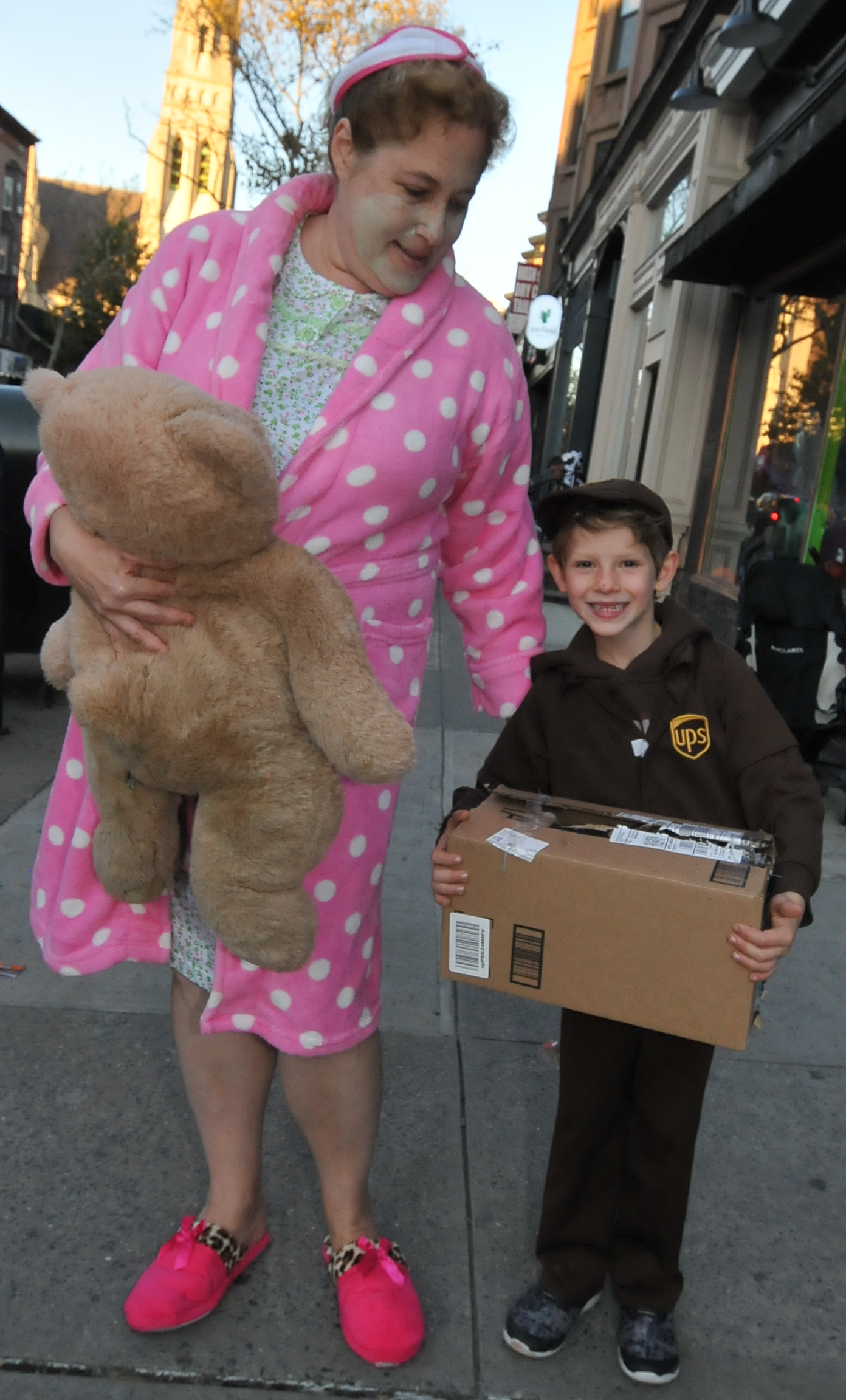 5:20 PM. Mom in a bathrobe?, with a little UPS delivery man.