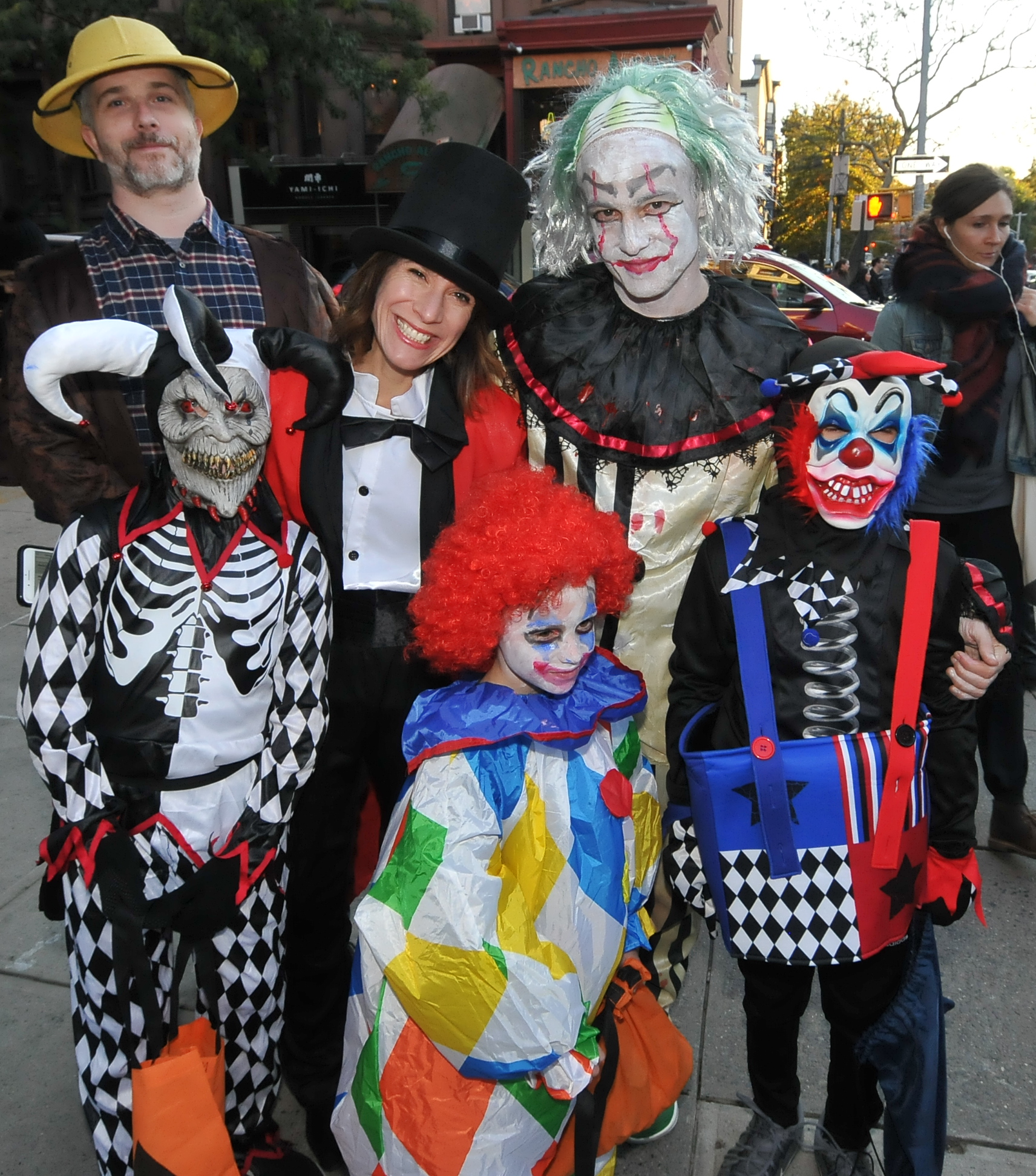5:21 PM. A Sinister Jester costume from Amscan, a magician, a little clown, a big clown, and a Freak in a Box from Blossom Costumes.