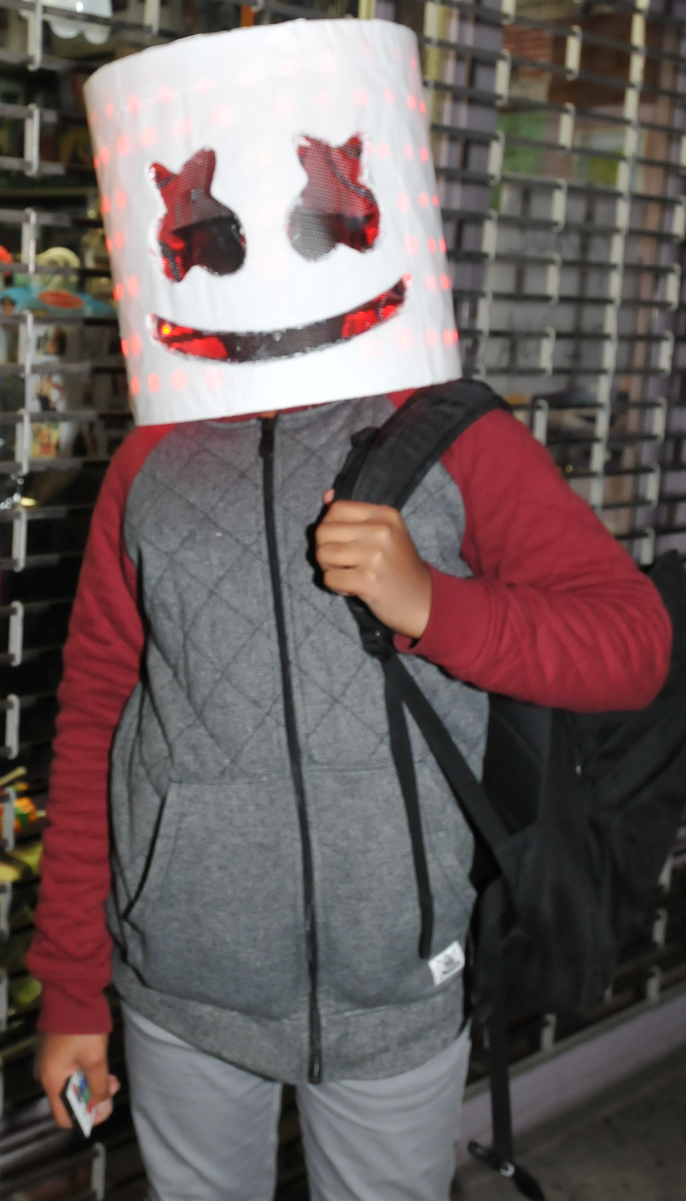 6:46 PM. The Marshmello helmet used by DJ Marshmello. There were red lights glowing through the drum. The flash washed most of them out.