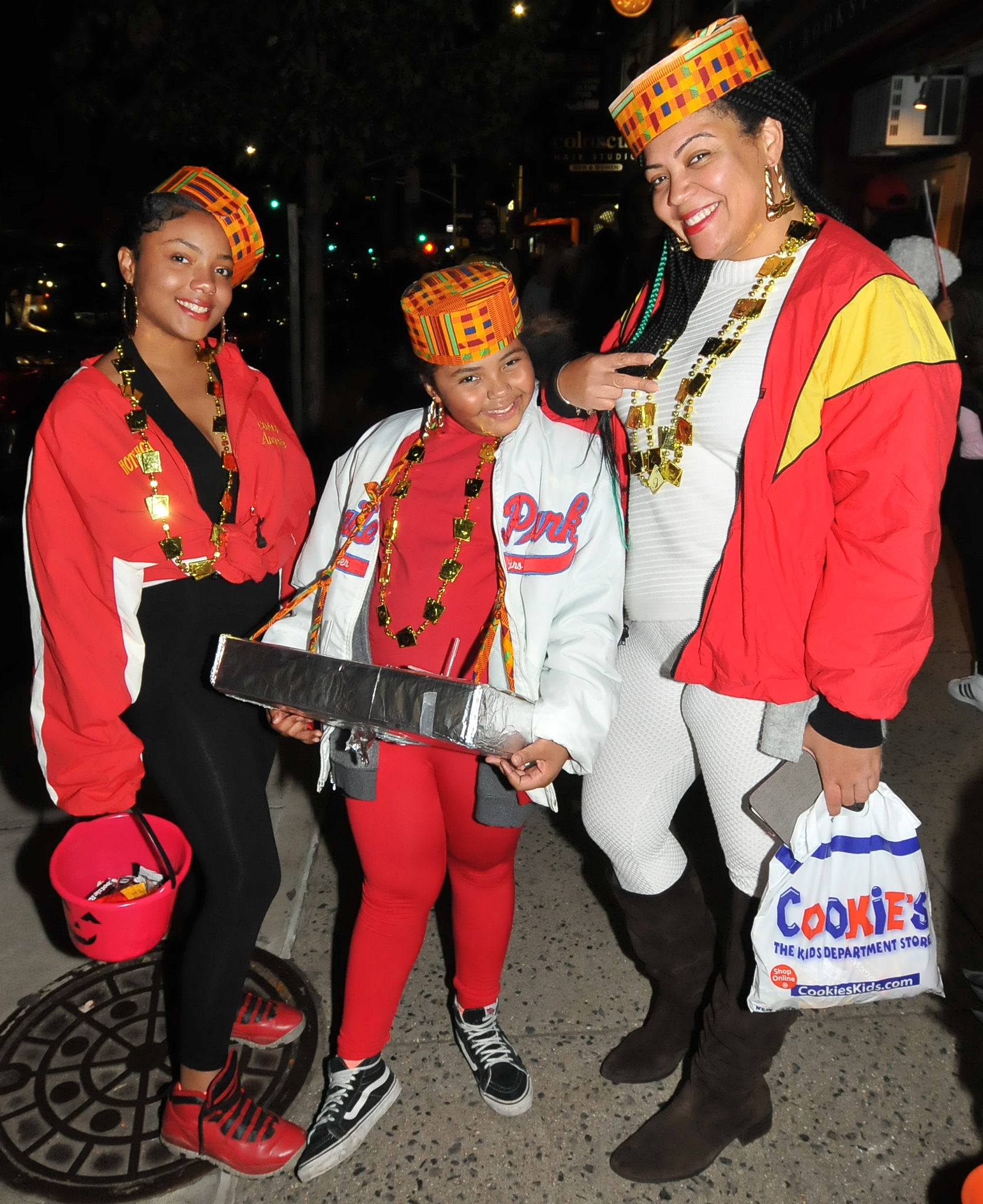 6:47 PM. A group representing the 1990s hip-hop group Salt-N-Pepa, particularly their "Push It" era costumes.