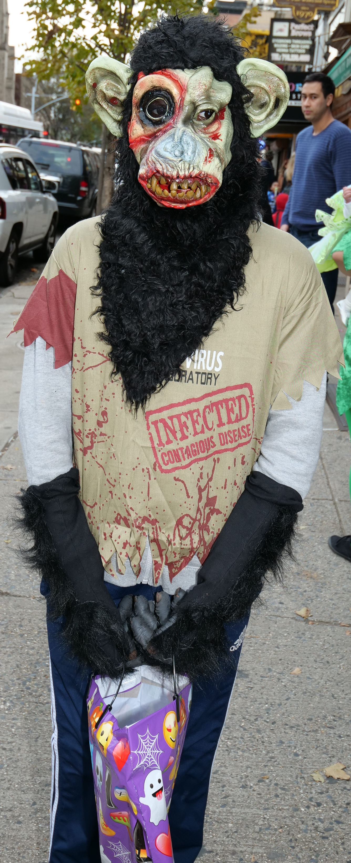 4:56 PM. A Zombie Chimp costume. Shirt has "Anti Virus Test Laboratory - Infected Contagious Disease"