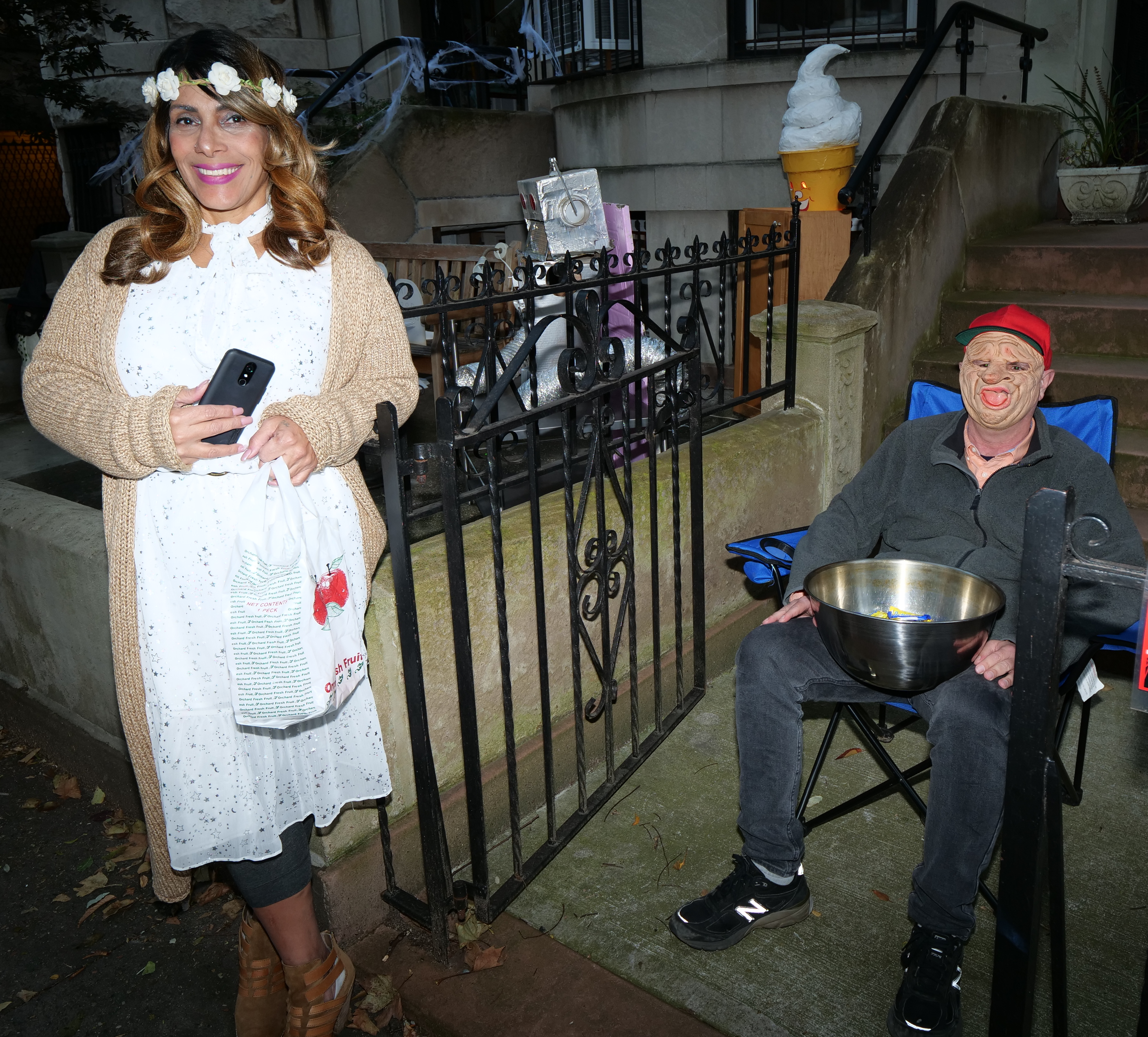 5:39 PM. More neighbors. His regular pig mask. She's a flower girl.