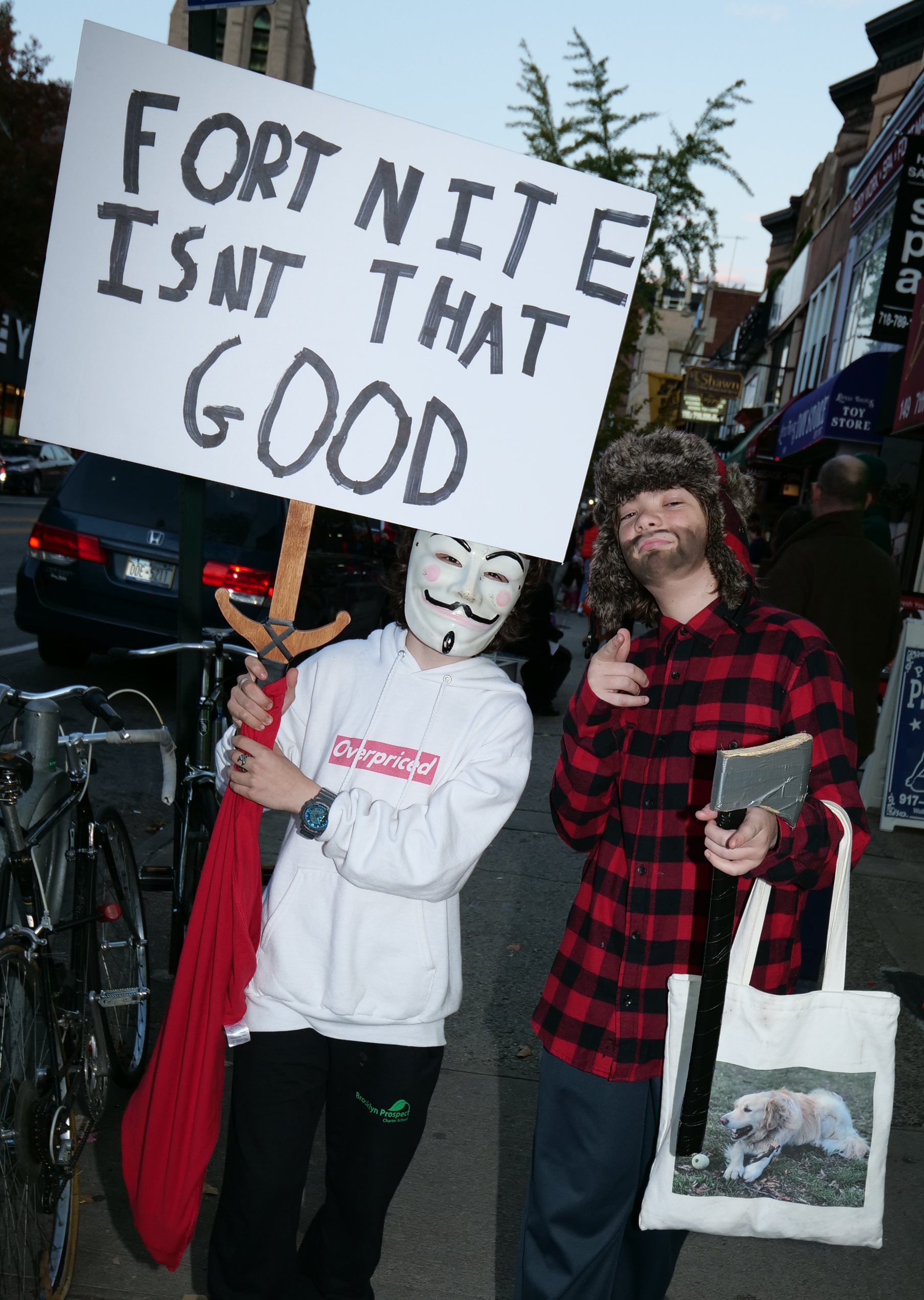 5:51 PM. The guy on the left is in a Guy Fawkes mask. His sign "Fort nite isnt that good" is an example of an Anonymous protest. At right is a lumberjack.