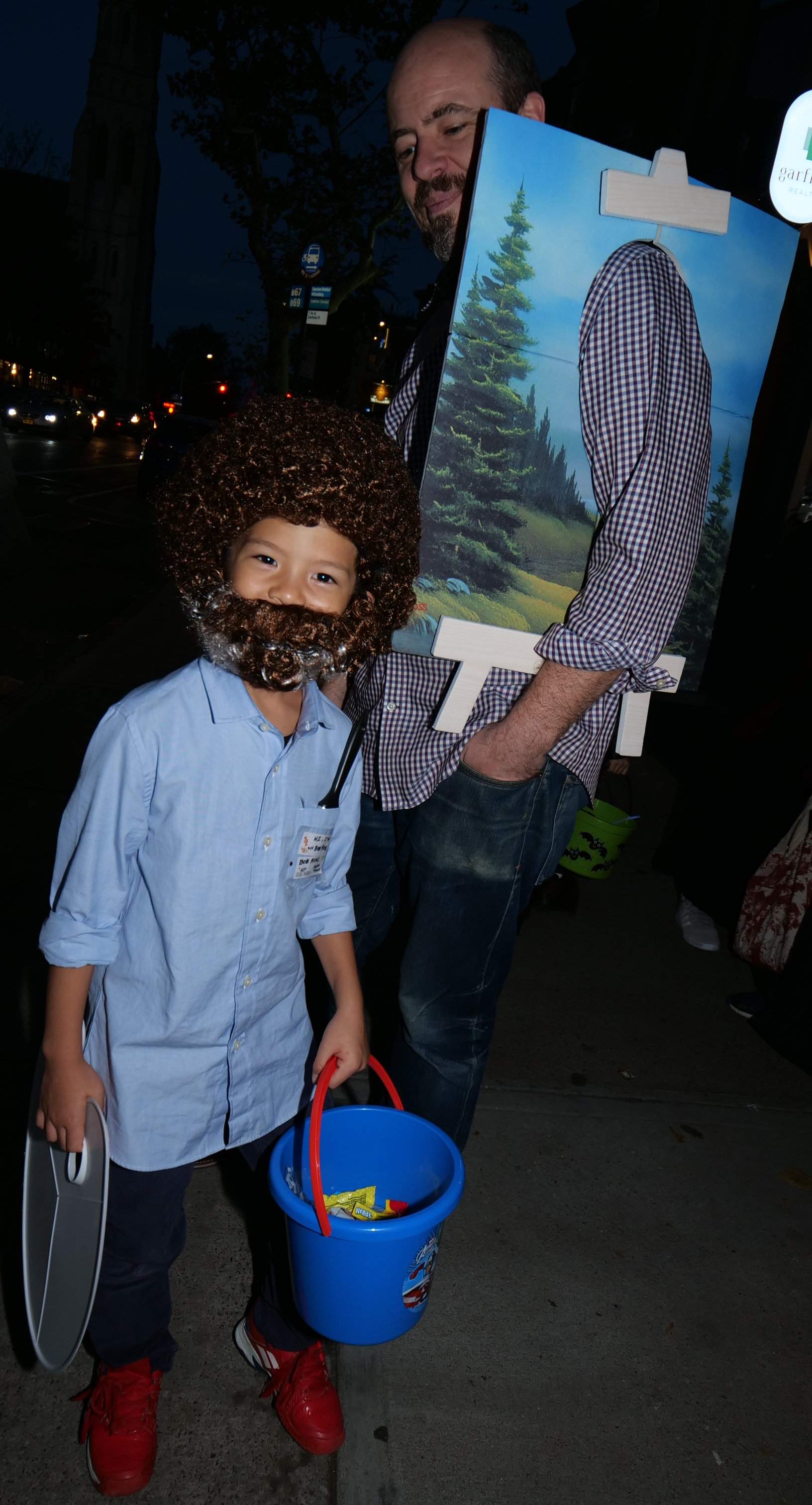 (the little kid) and one of his paintings (the father).