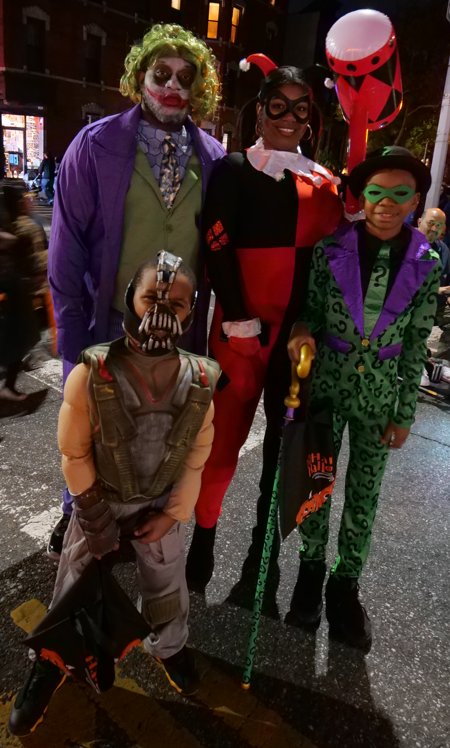 6:51 PM, DC Comics villains: the Joker, Harley Quinn, Riddler, and in front, a child dressed as Bane.