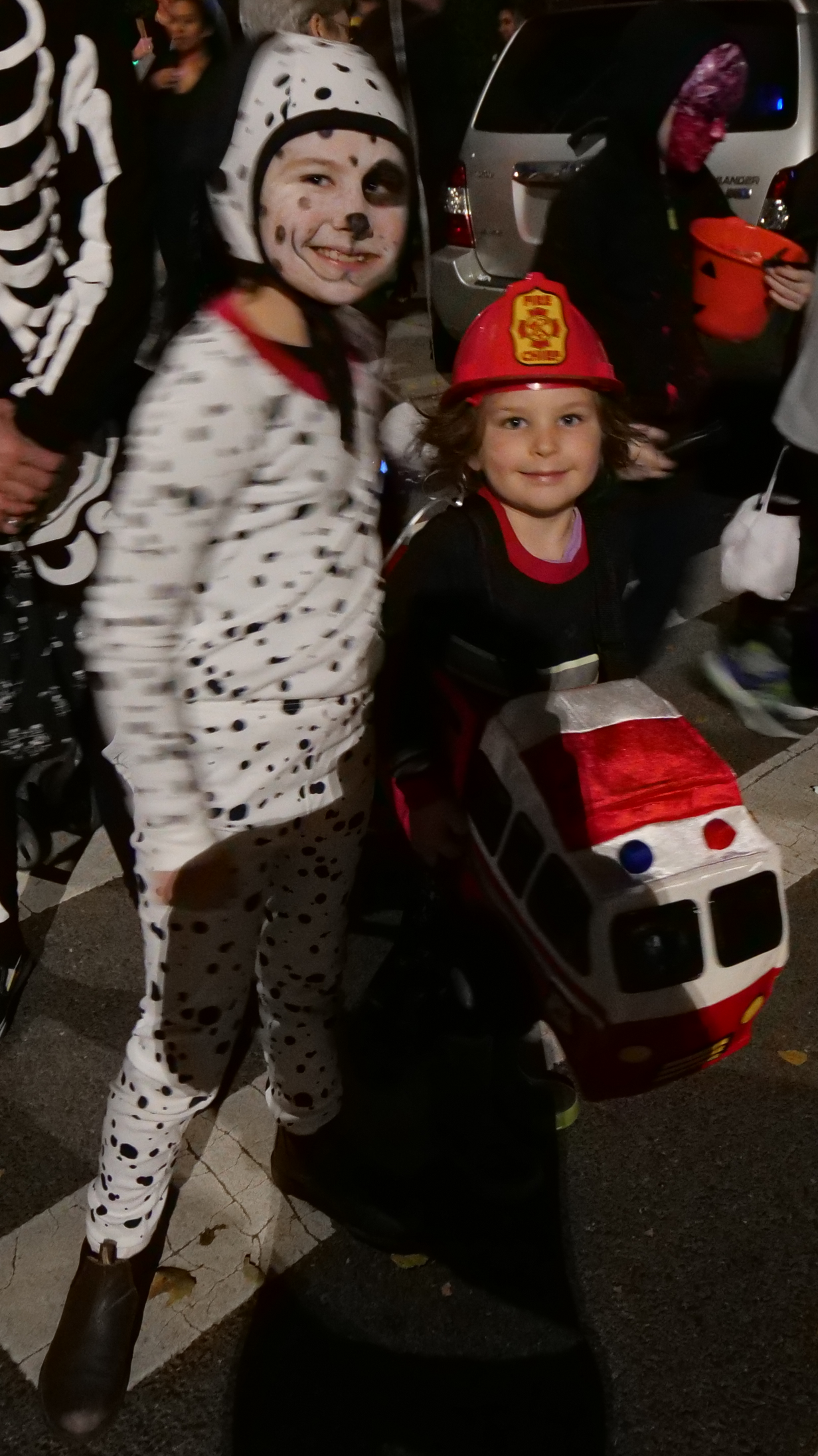 7:03 PM. A dalmatian fire dog, and a fire chief in her engine. [My shadow made a mess of this picture.]