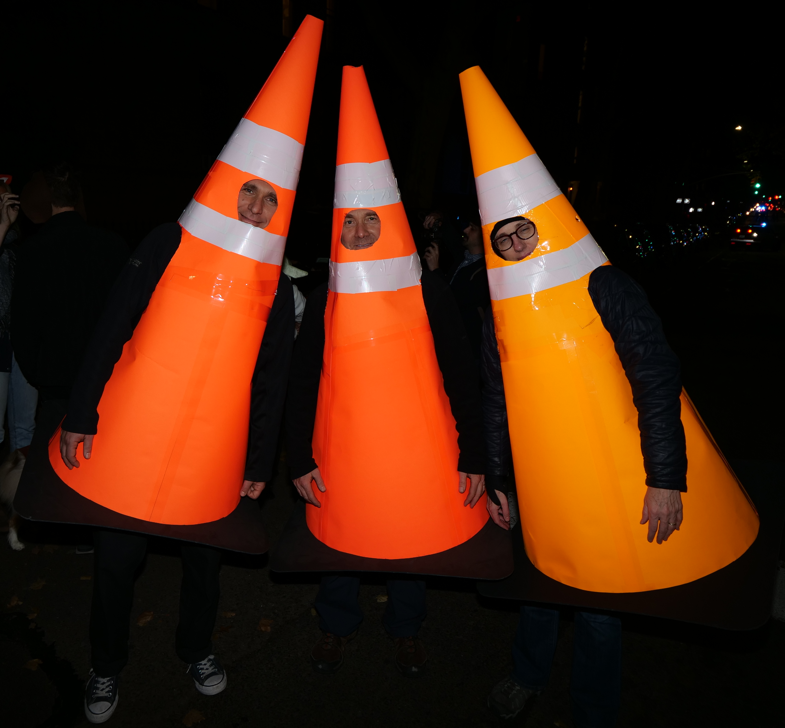 7:25 PM. Safety cones, commonly called traffic cones. They had black bases, which are hard to see. They were made by the woman on the right. She said they were quite hard to make.