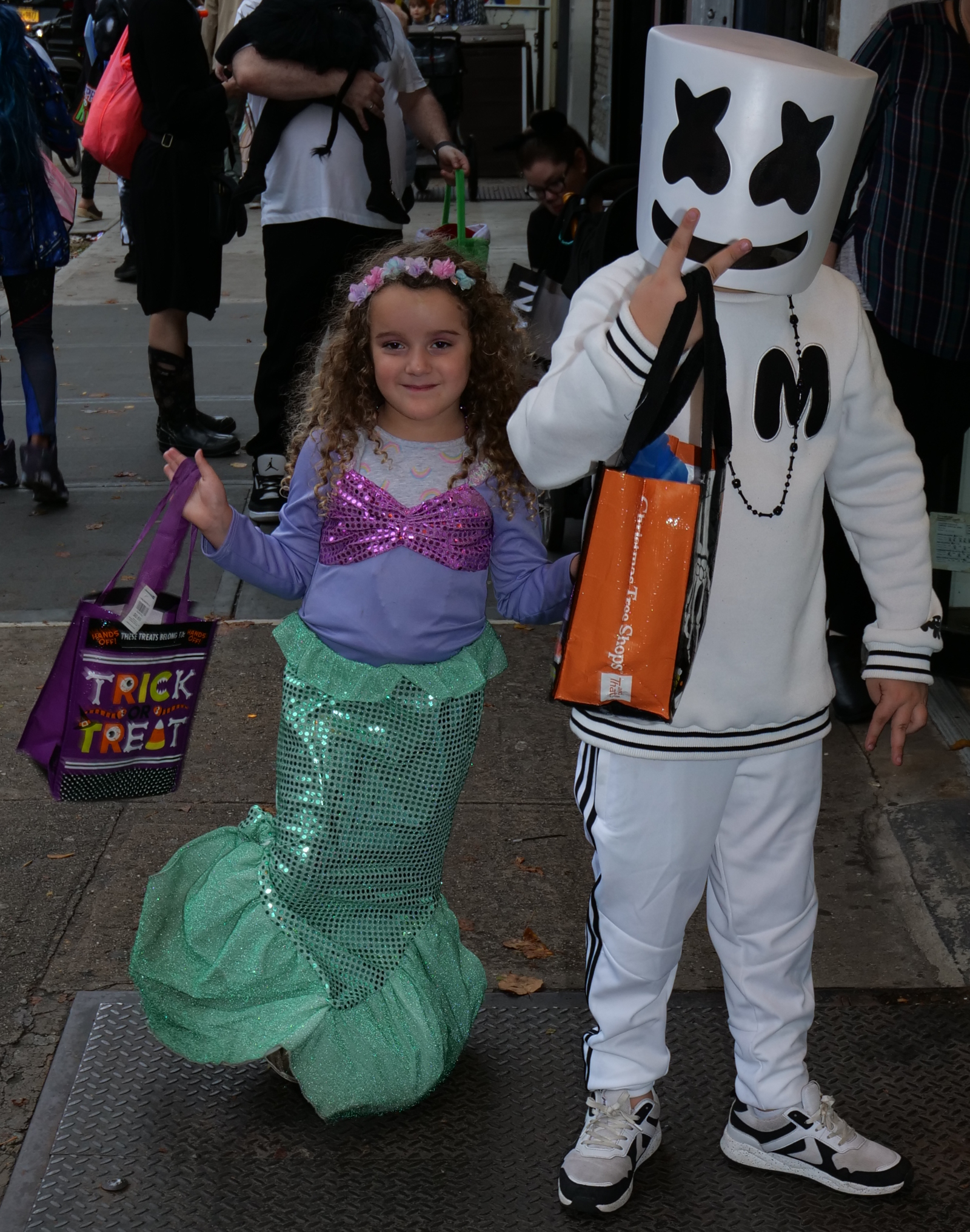 5:05 PM. The Little Mermaid, and a DJ Marshmello costume. Marshmello is an American DJ and electronic music producer. He wears this costume when performing.