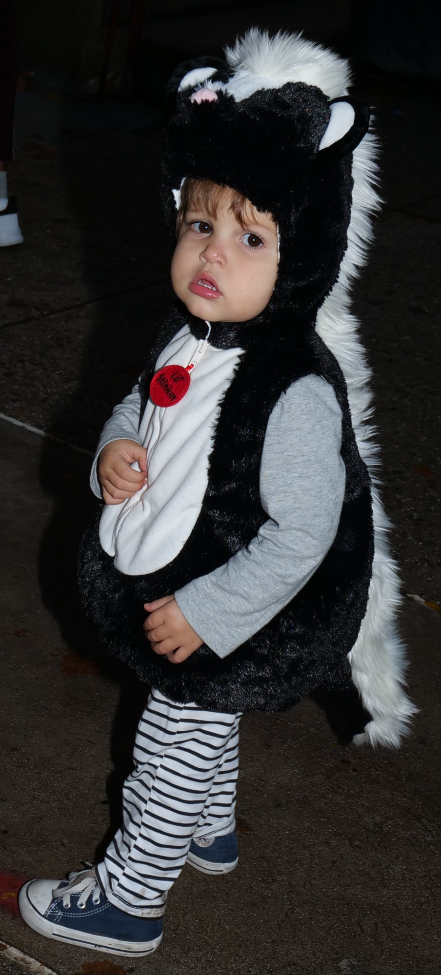5:48 PM. Lil' Stinker. One doesn't usually see skunk costumes. (It isn't easy to get a young kid to turn at an angle. They want to face you straight on.)