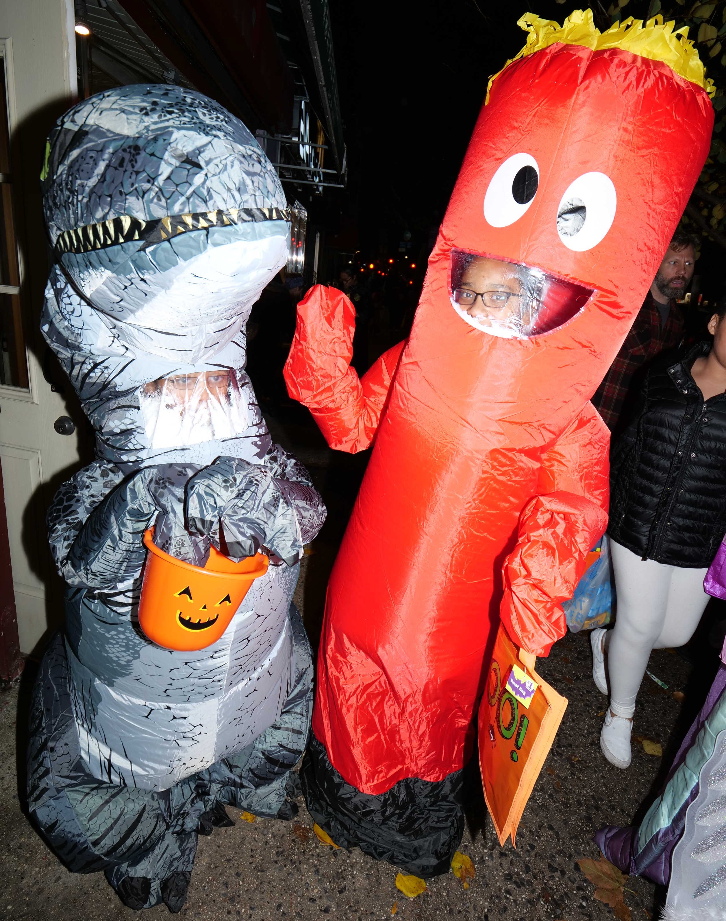 6:16 PM. An inflatable dinosaur and the inflatable Tube Guy, or Air Dancer.
