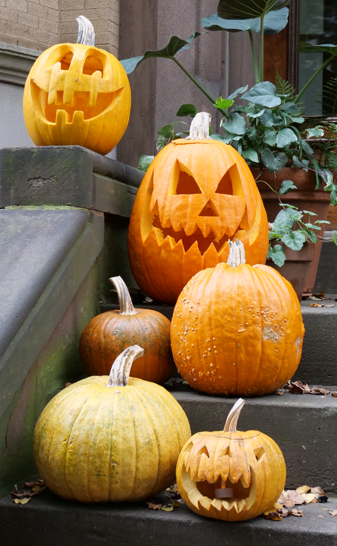 1st St, my block. Jack-o'-lanterns and pumpkins on a stoop.