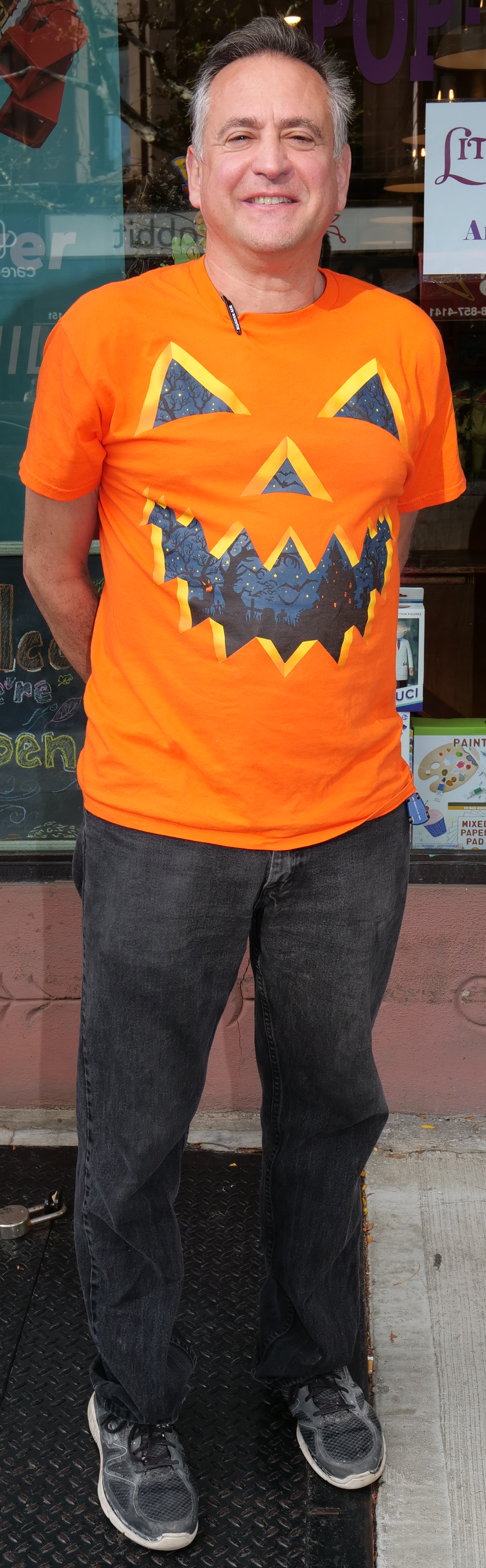 3:22 PM. Mitch alone. Jack-o-lantern pumpkin T-shirt.