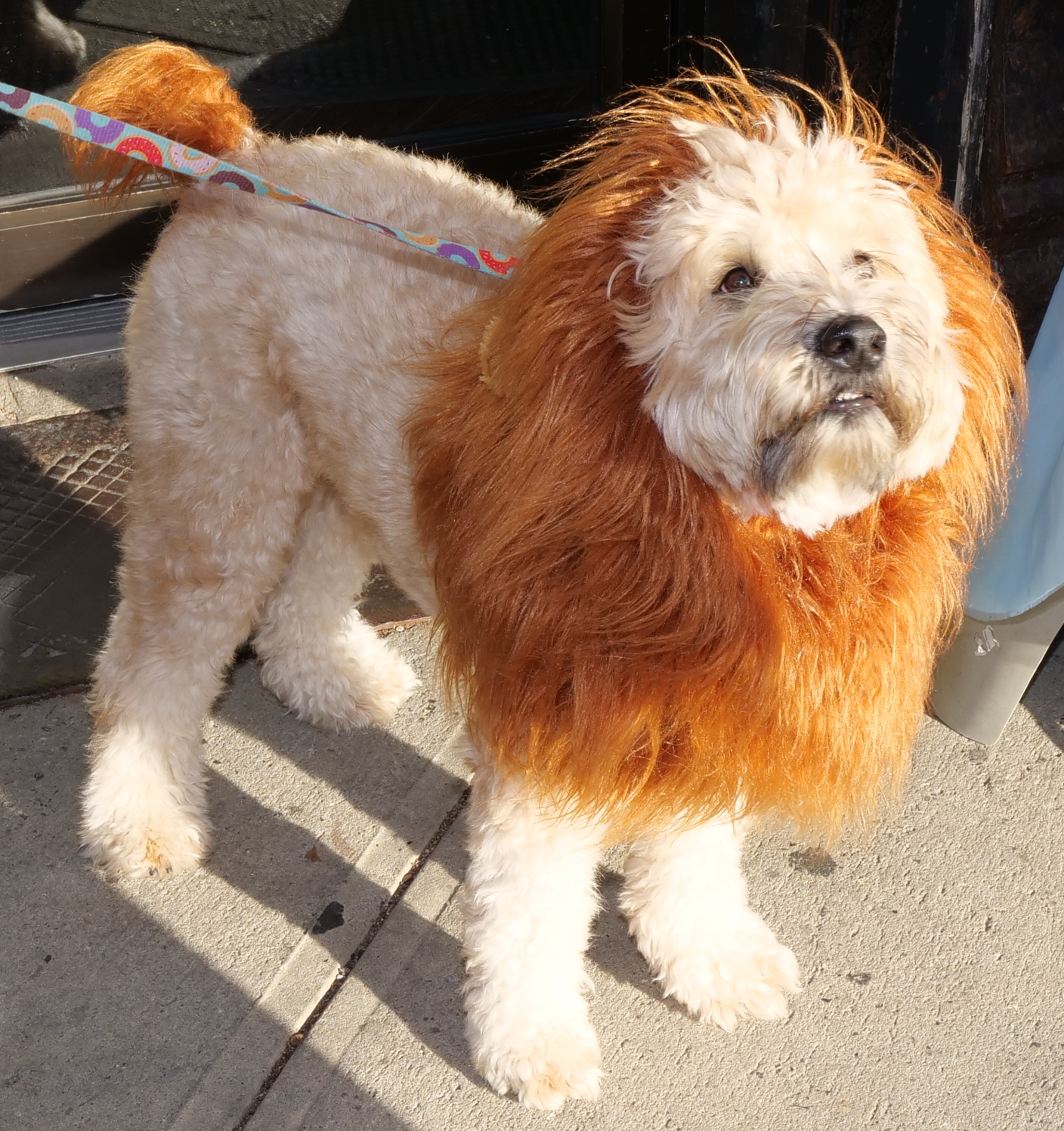 3:57 PM. A dog in a lion costume. The mane had ears that you can't see.