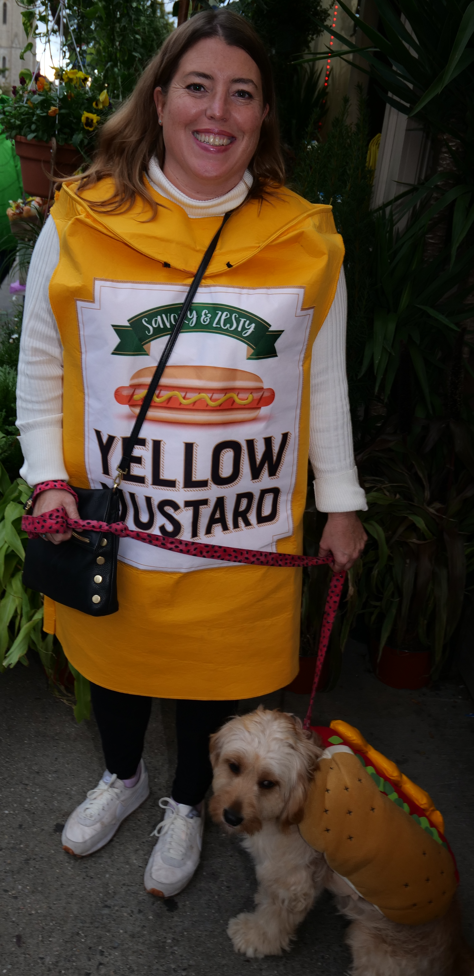 4:58 PM. A yellow mustard jar and a dog dressed as a hot dog.