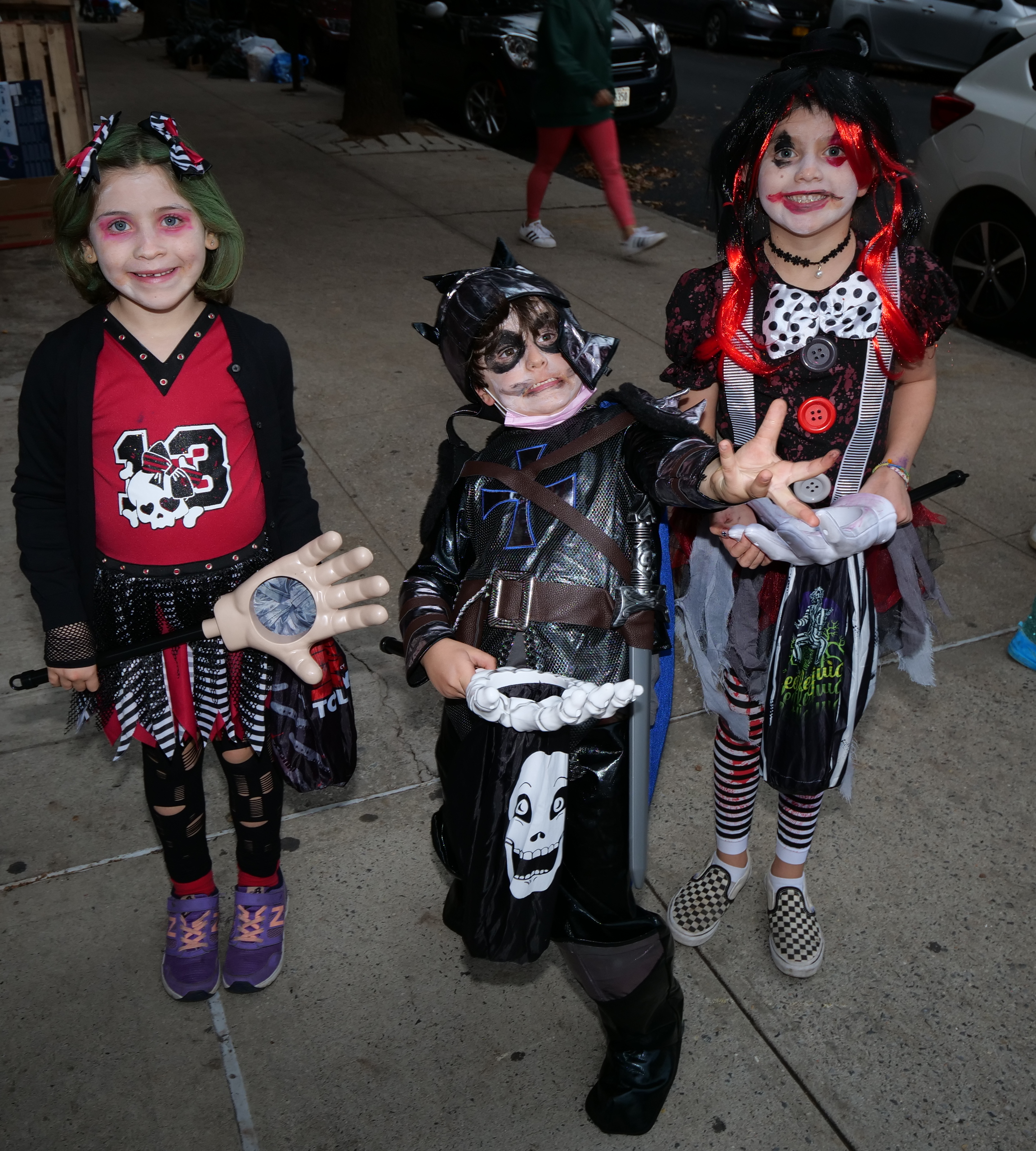 5:04 PM. A zombie cheerleader, a black knight, and a zombie clown.