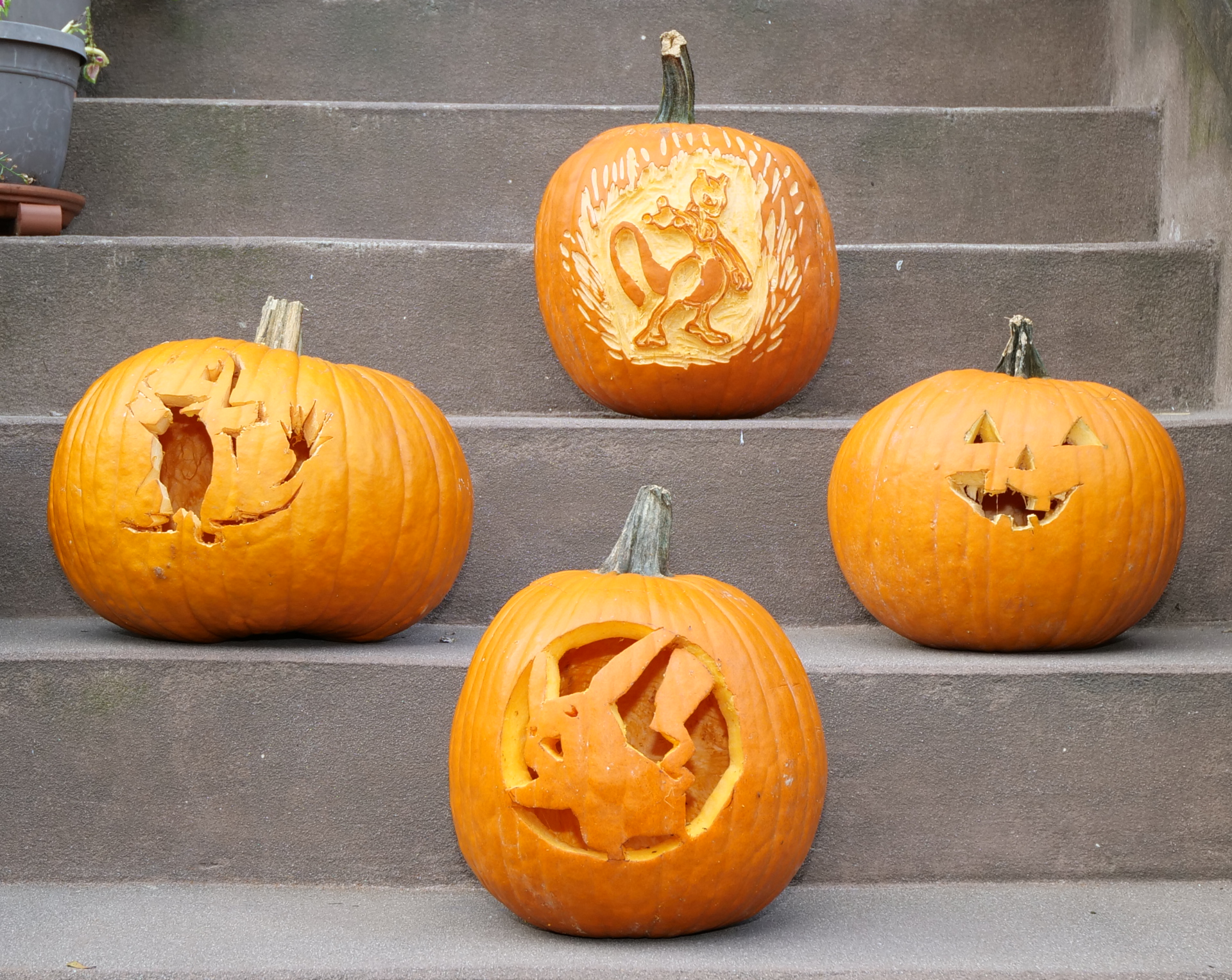 484 1st St. Three jack-o'-lanterns and a carved pumpkin.