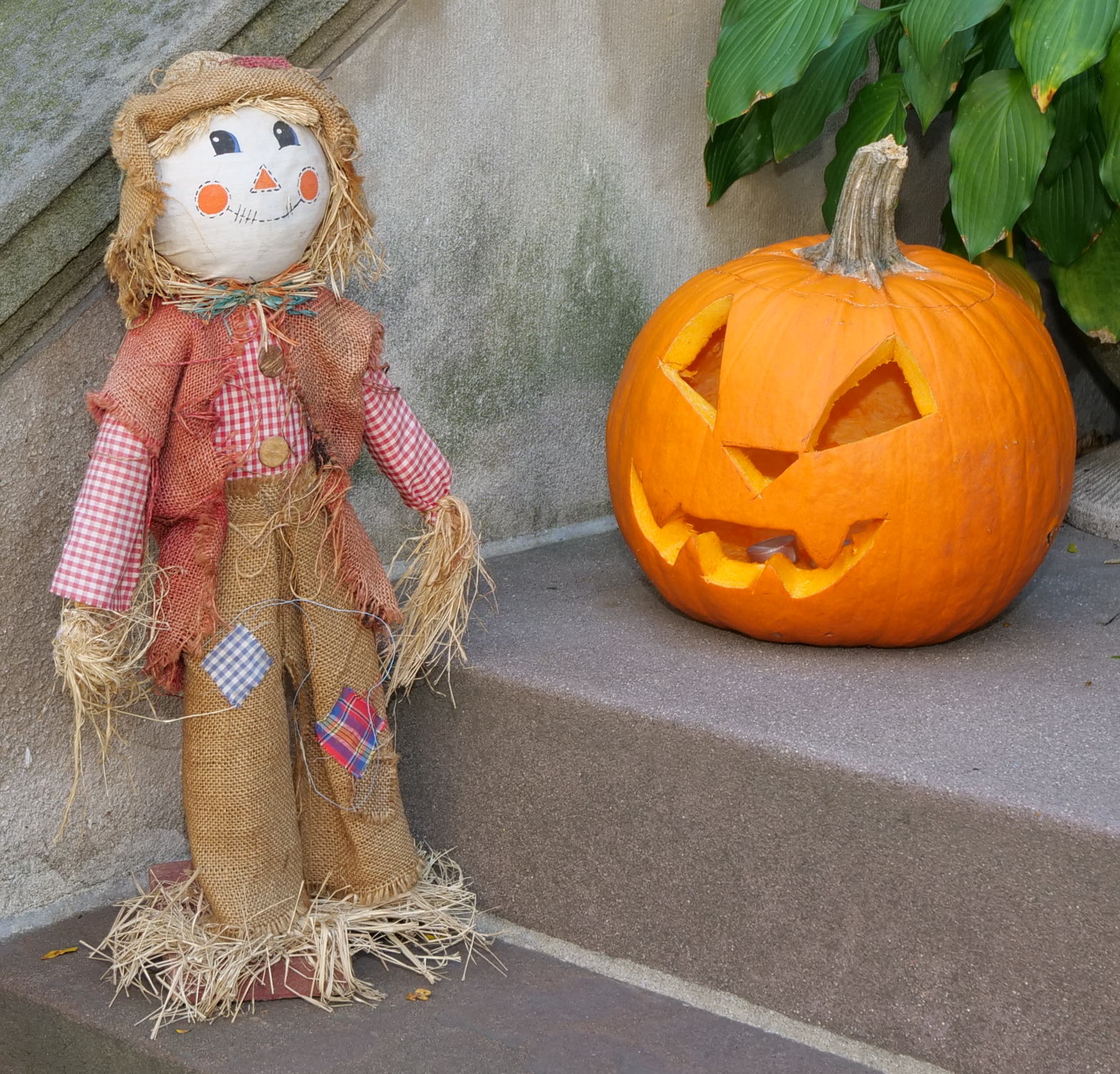 550 1st St. A scarecrow and a classic jack-o'-lantern.