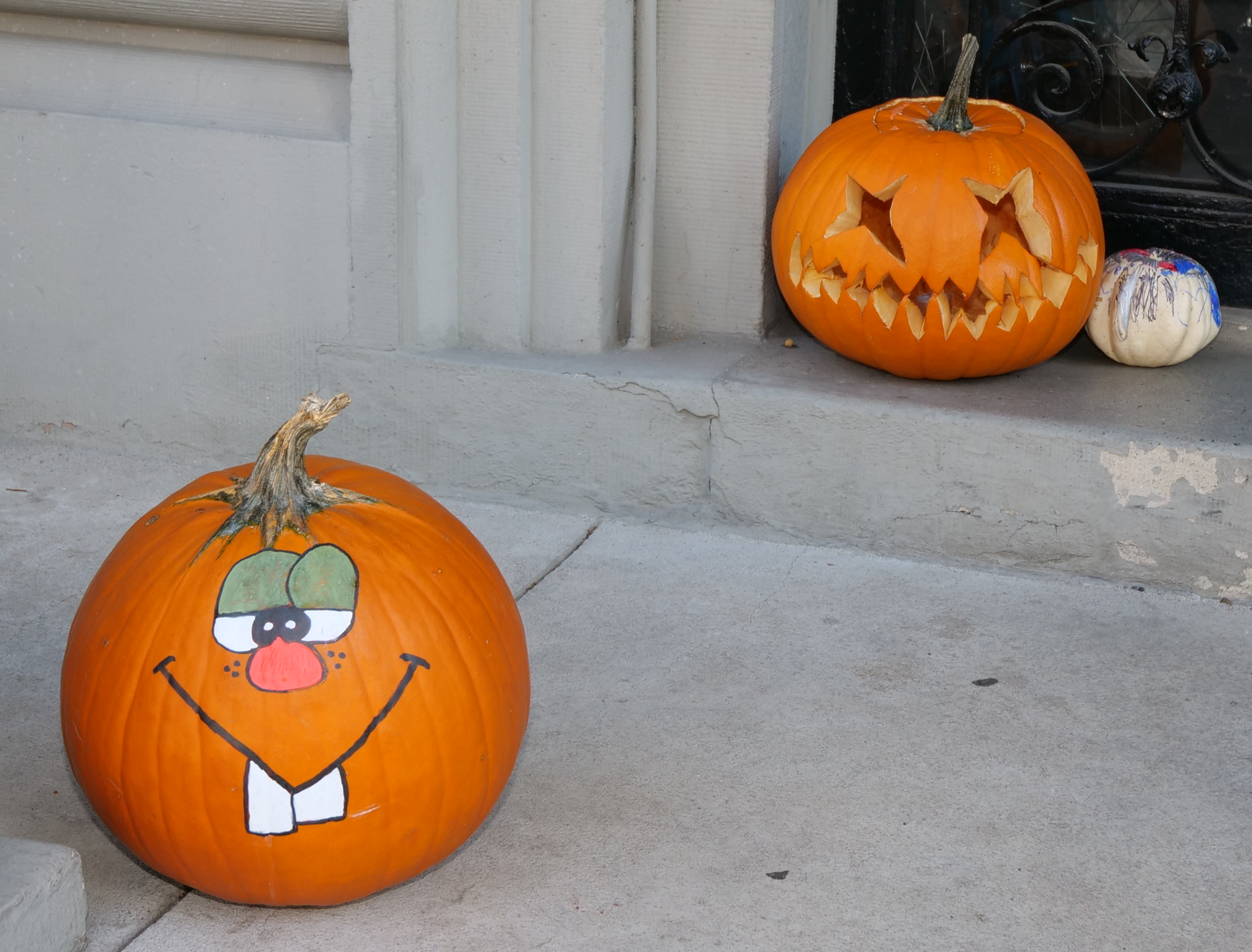 225 8th Ave. A painted pumpkin and a jack-o'-lantern.