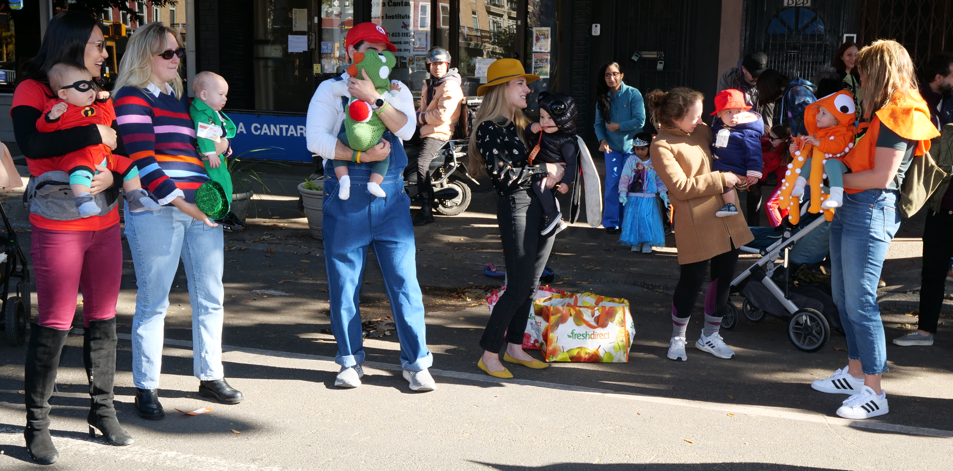 10/29, 2:09 PM. All of the contestants in the babies category: Jack-Jack Parr from The Incredibles, an Irish leprechaun, Yoshi costume from the Super Mario Bros. franchise, a fly, and Paddington from the movie of the same name.