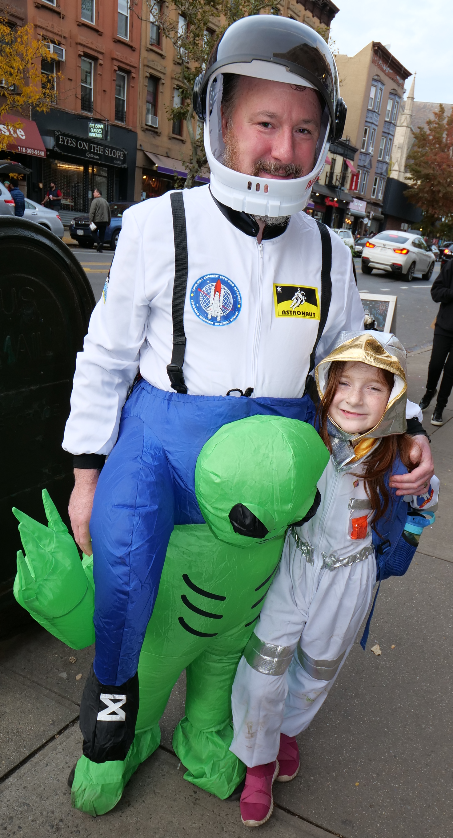 4:44 PM. An inflatable astronaut with an alien. Child is also an astronaut.