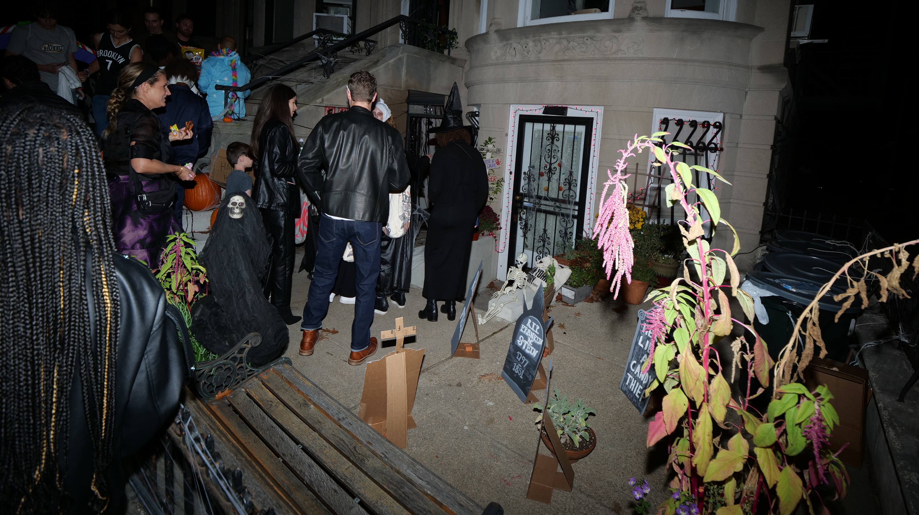 7:52 PM. People lined up waiting to enter the haunted house at the southwest corner of 8th Ave and 1st St.