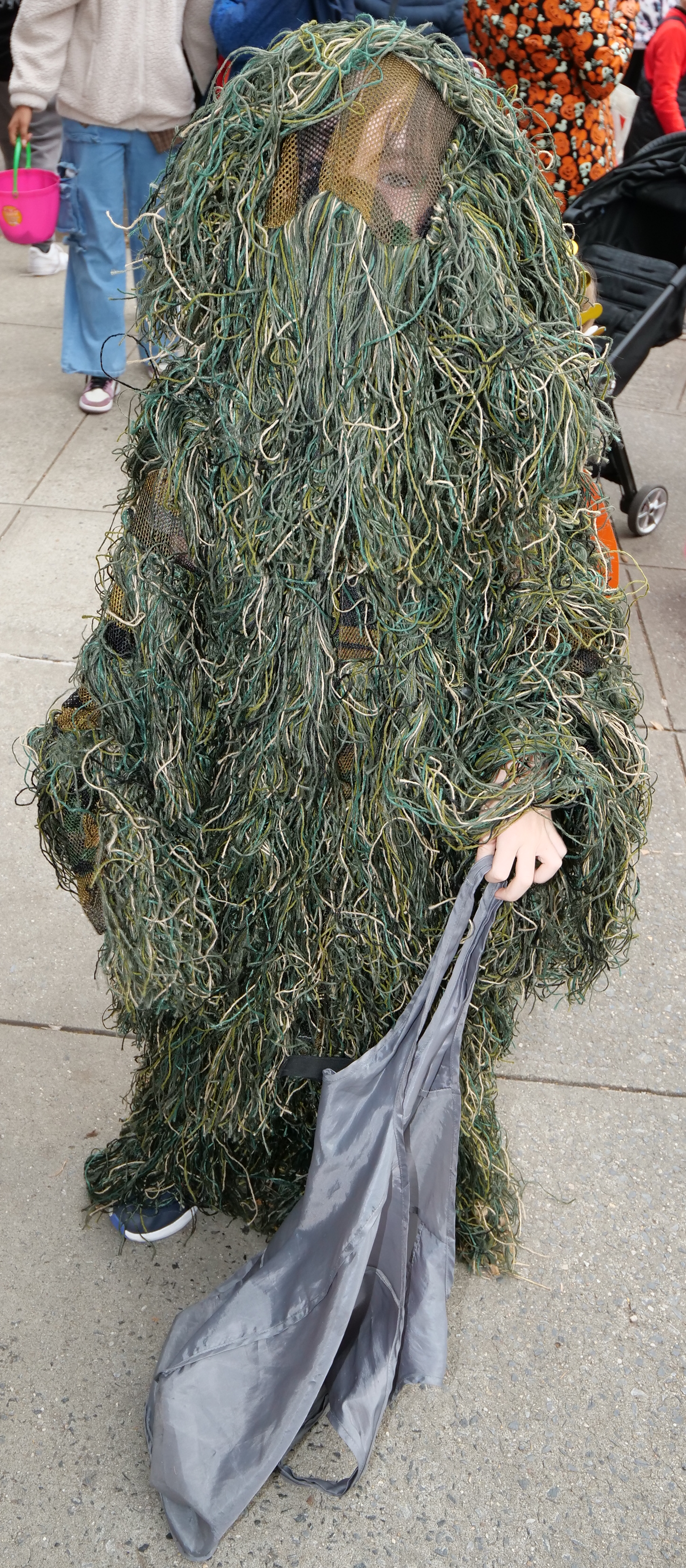 4:22 PM. A Gillie suit. A camouflage suit for bird watching and hunting.