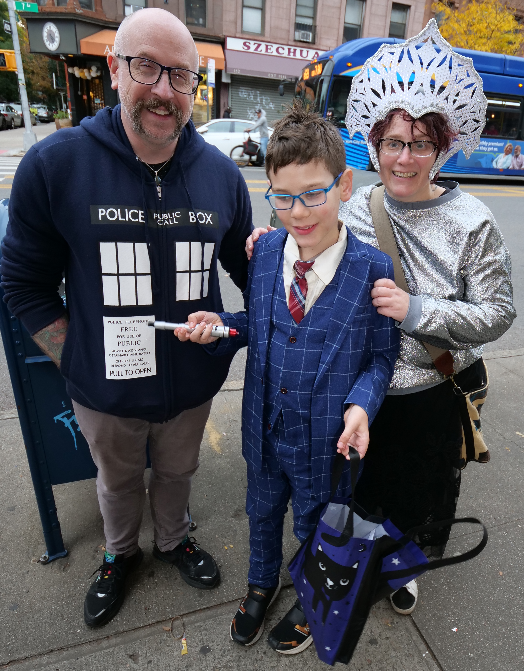 5:08 PM. Costumes inspired by the TV show Doctor Who: TARDIS, the Doctor's time machine disguised as a police call box; the boy dressed as one of the many incarnations of The Doctor, the woman's kokoshnik headdress is from the "Empress of the Racnoss" costume from the special, "The Runaway Bride."
