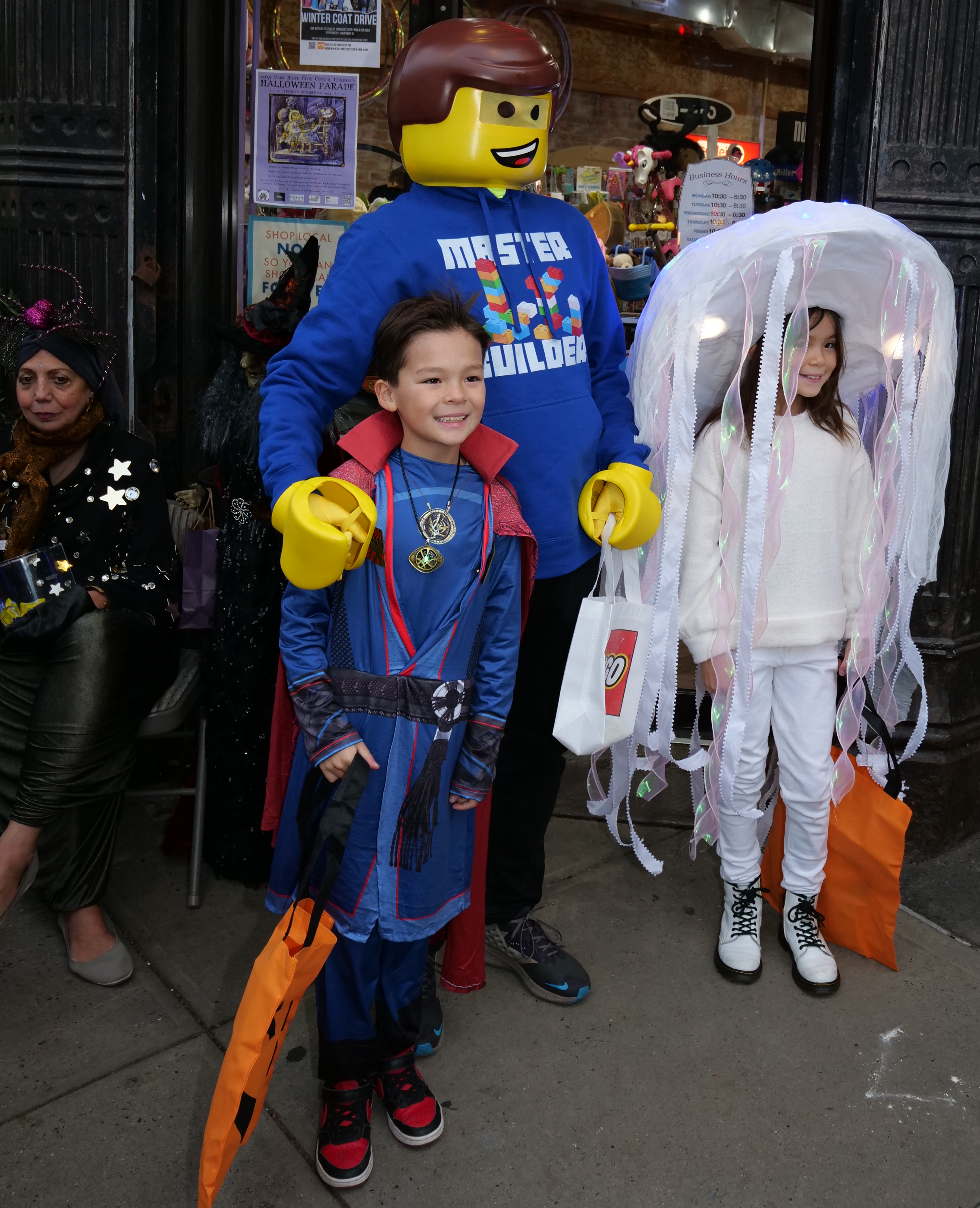 5:22 PM. Doctor Strange costume from Amazon, Legoman Master Builder, and a jellyfish. Shelley sitting at far left.