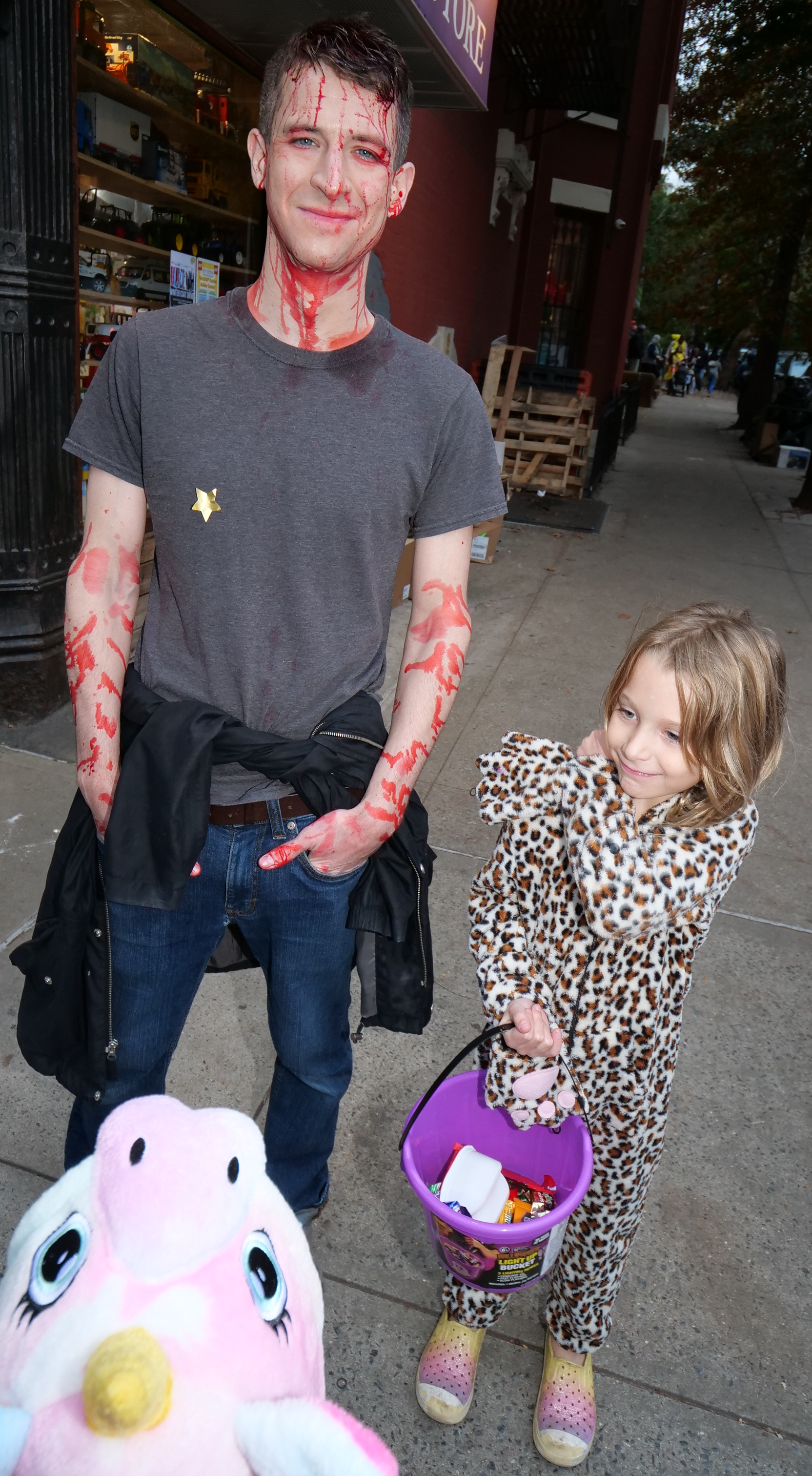 5:36 PM. Man with fake blood. She, in a leopard skin costume, had to be careful to not get the blood on herself.