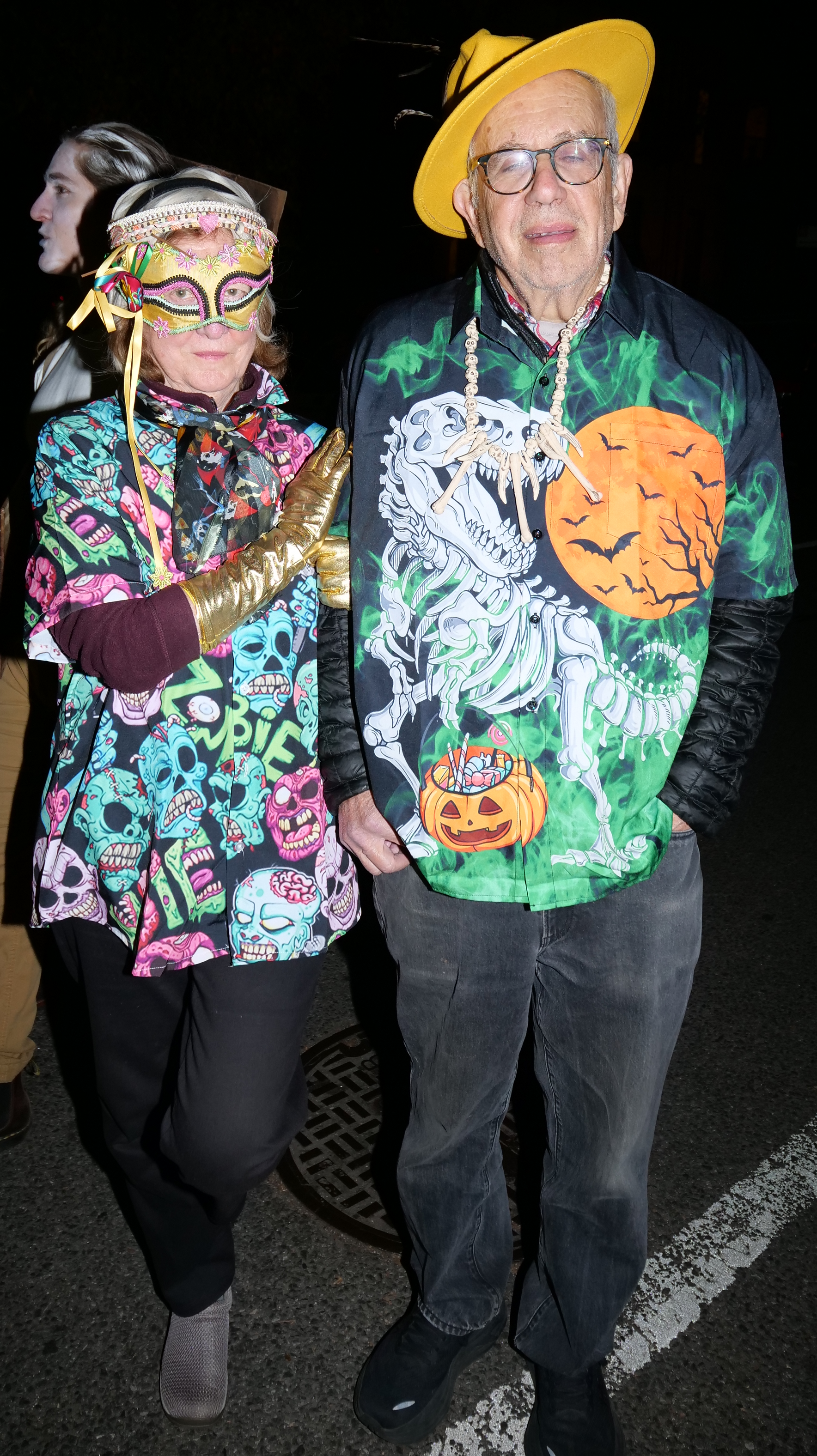 7:05 PM. Her shirt is Skull Head & Flowers pattern. His is a Halloween Dinosaur shirt. She's wearing a carnival maquerade mask.