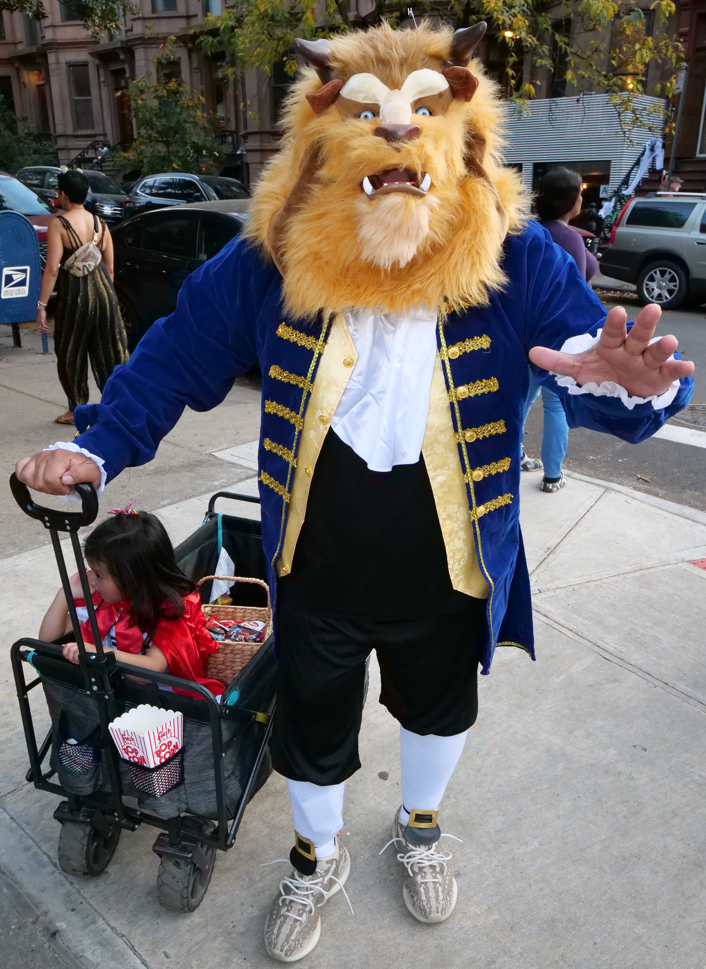 5:16 PM. Beast from Beauty and the Beast. A little Beauty is in the wagon.