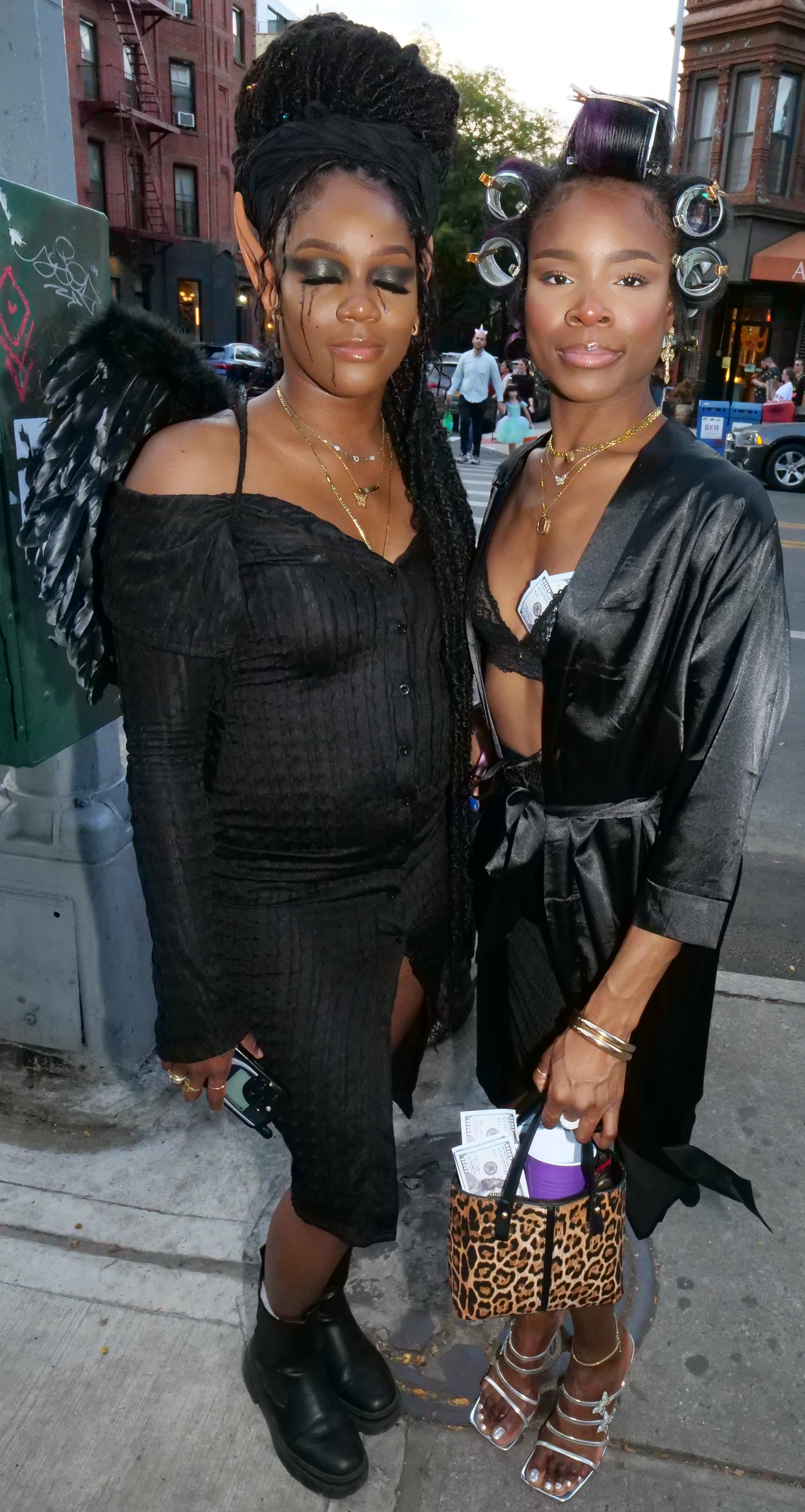 5:18 PM. The one on the left could be a fallen angel. She has black wings. The one on the right could be a hooker. But with hair curlers?