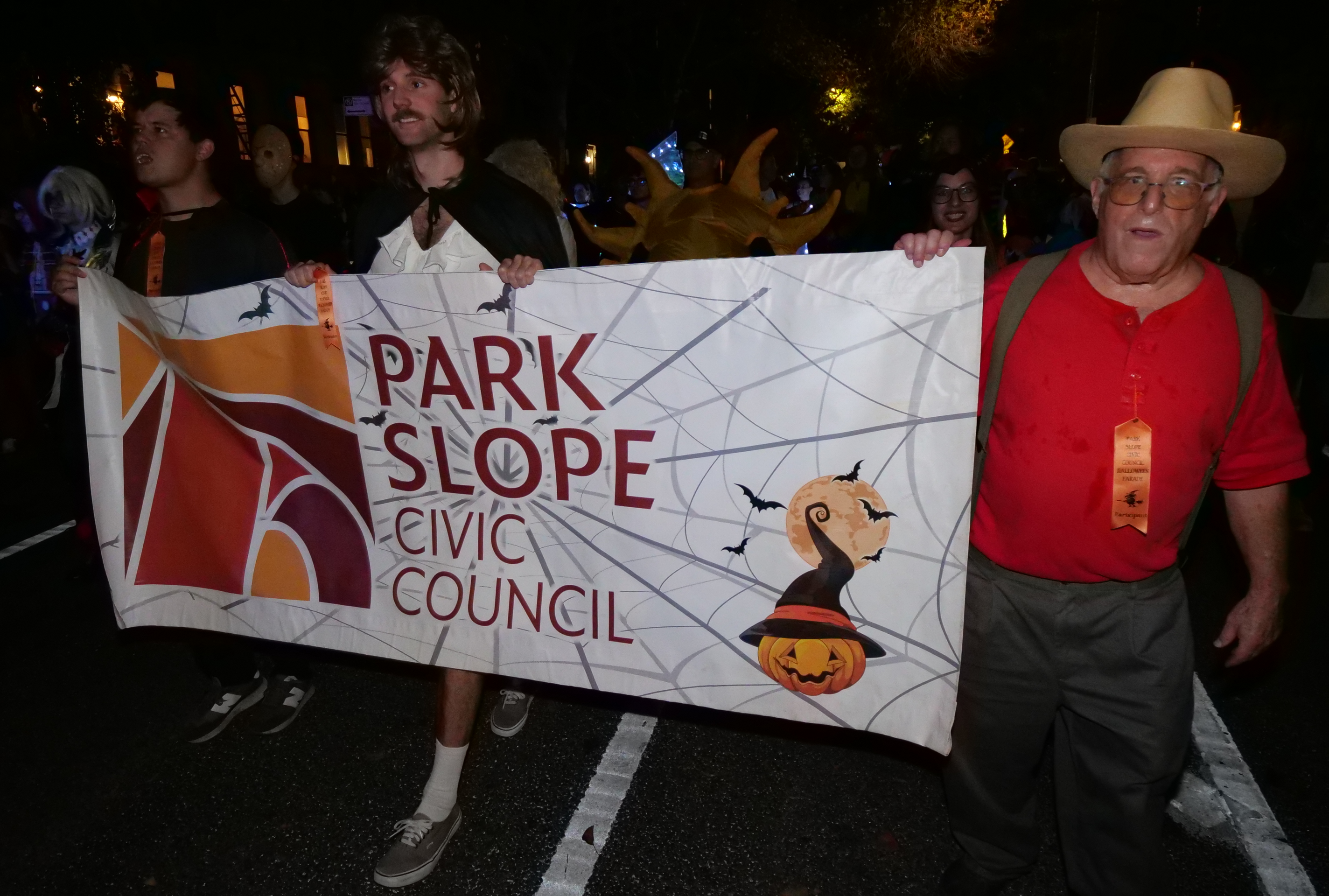 7:01 PM. The Park Slope Civic Council banner. Ron Weiss, secretary of the PSCC, is at the right.