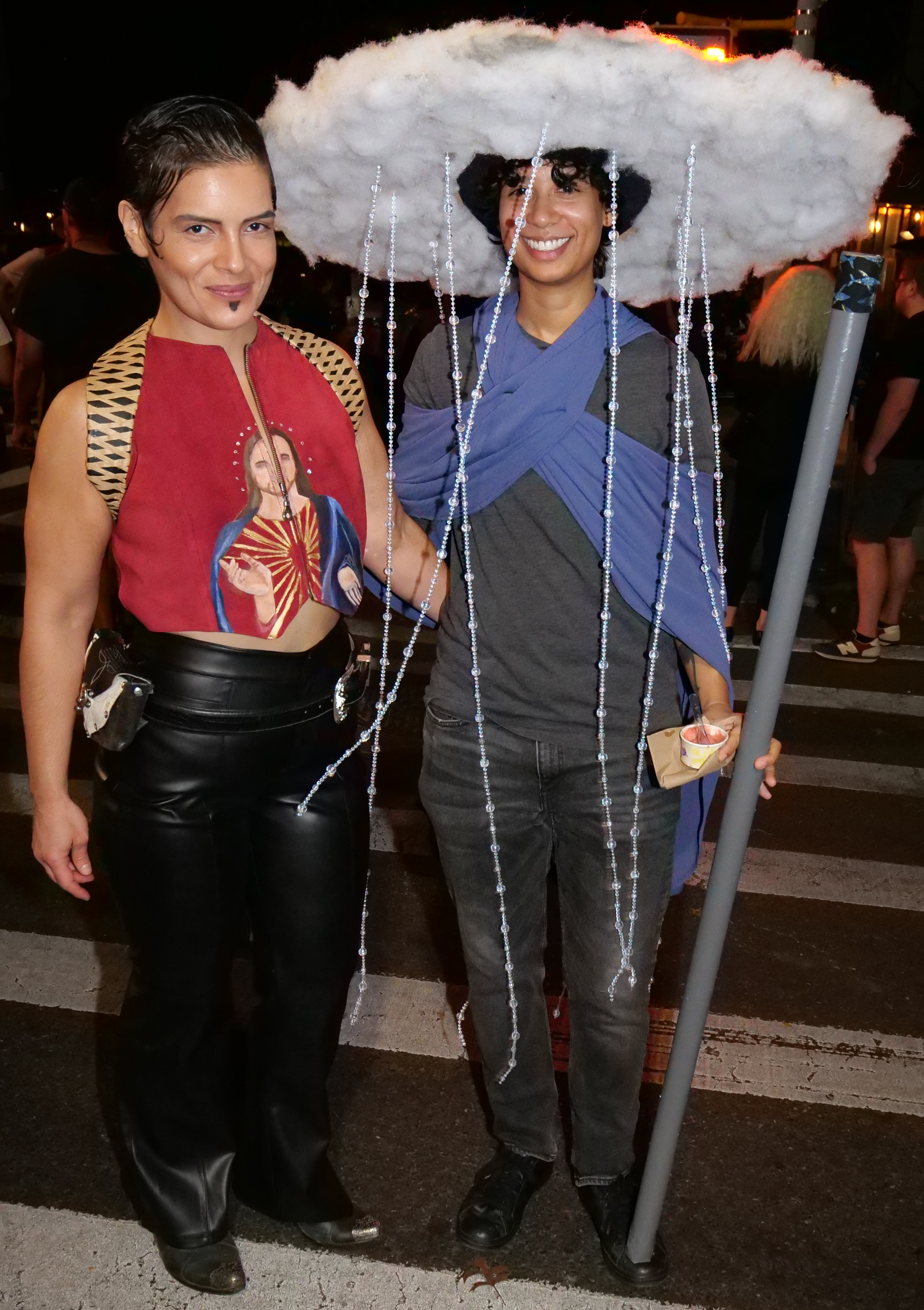 7:21 PM. A woman wearing a Jesus vest (who she?), along with a raining cloud.