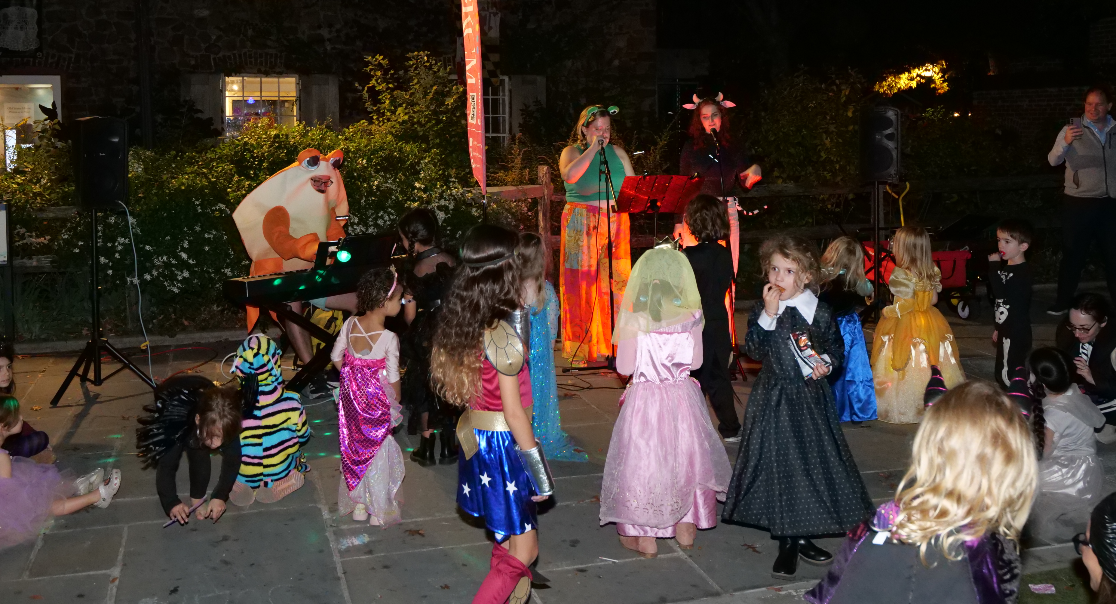 7:26 PM. In front of The Old Stone House was a band and small children dancing.