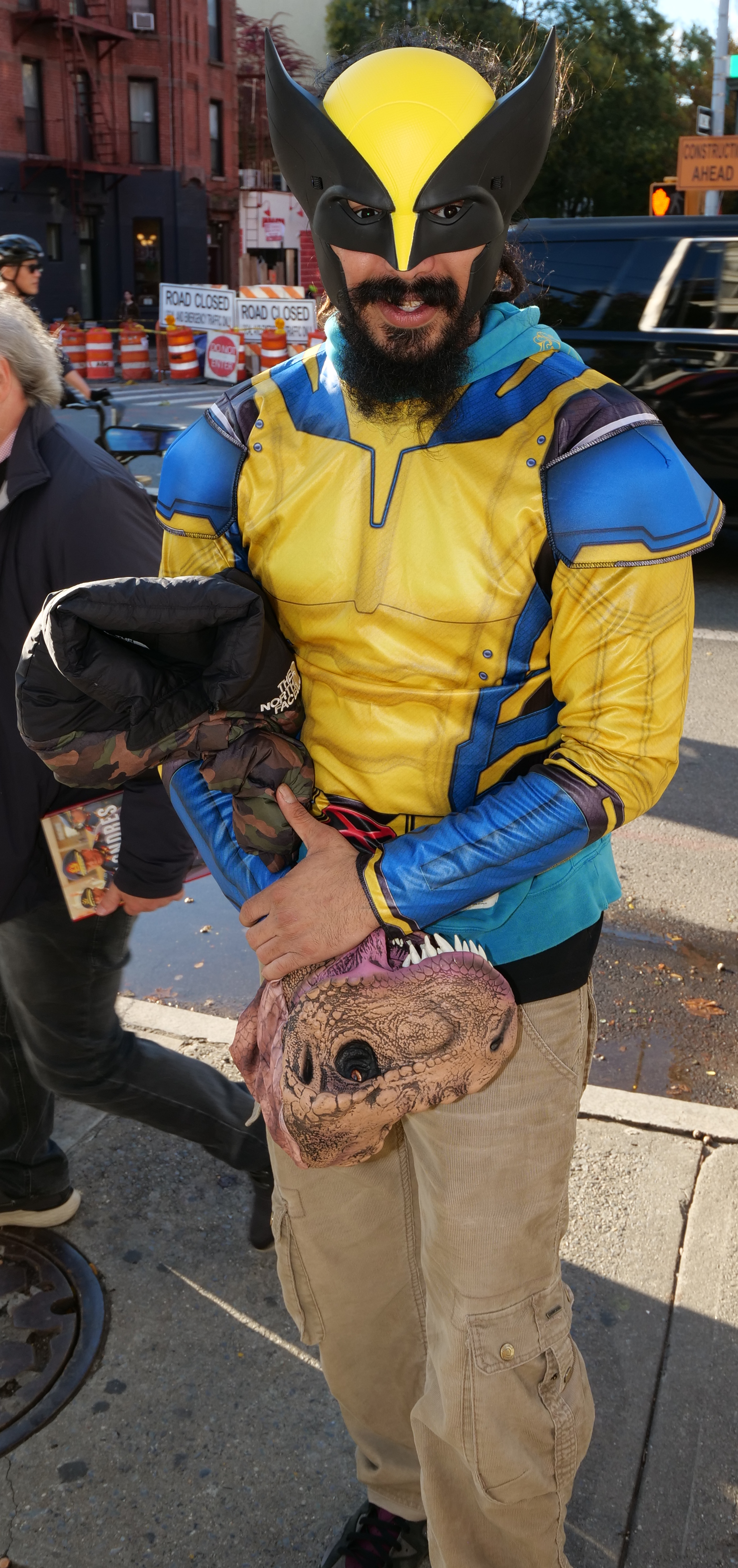 4:05 PM. Wolverine superhero with a T-Rex dinosaur mask on his right hand.