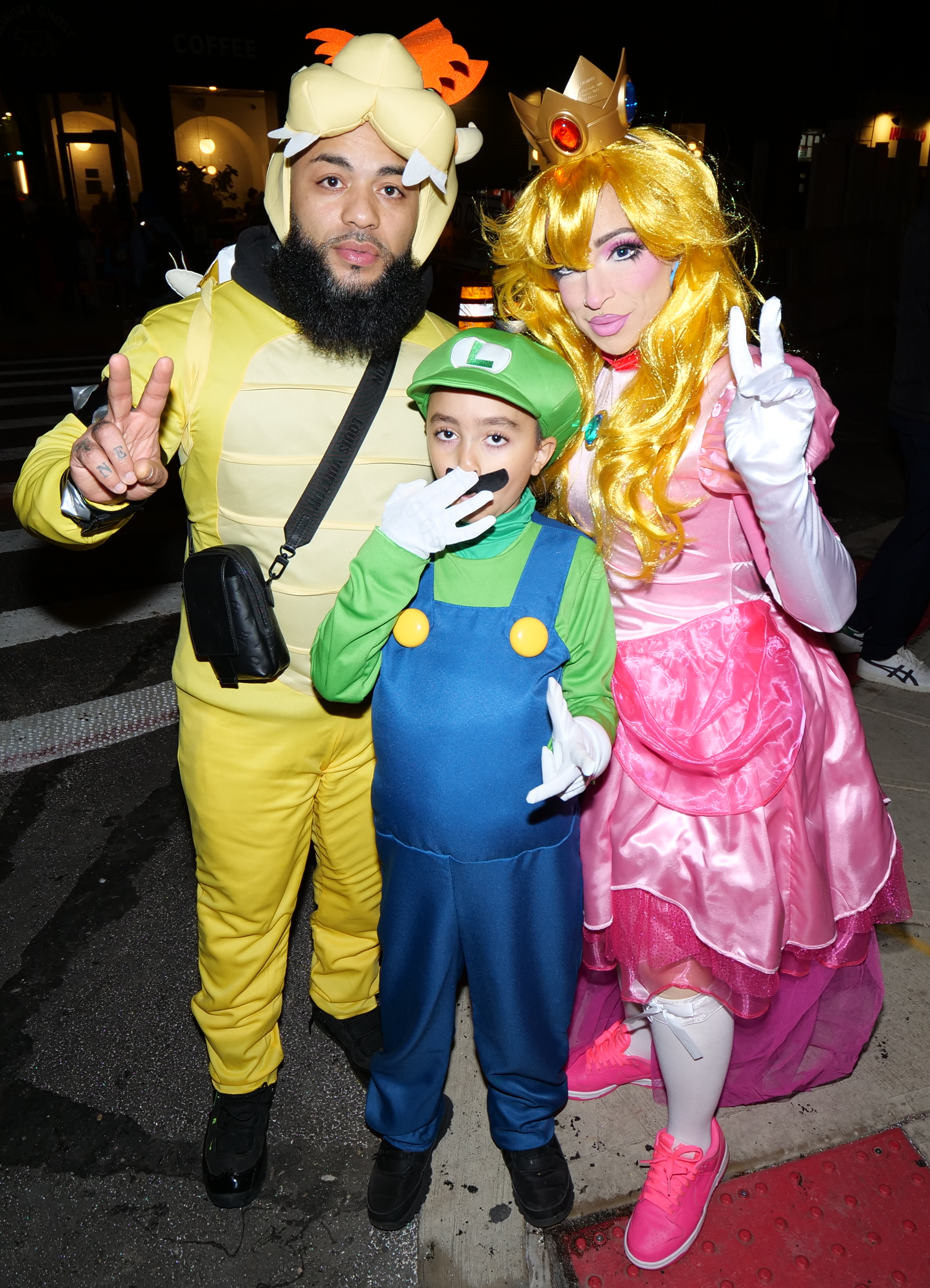 franchise characters: Bowser, the main antagonist; a little Luigi, and Princess Peach.